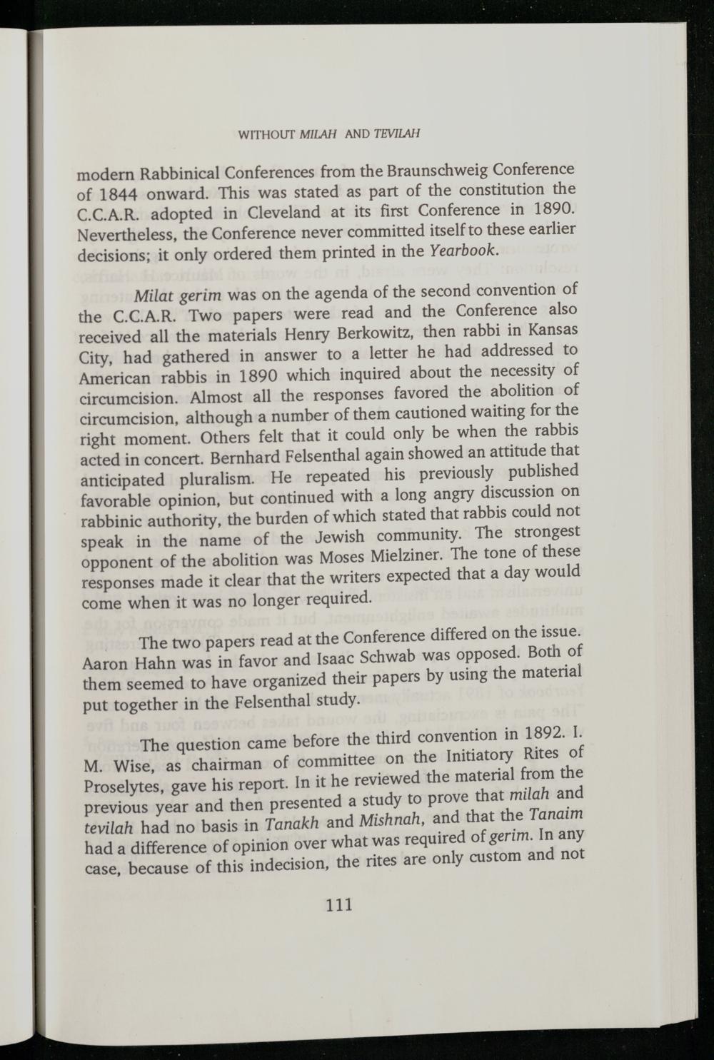 Milat gerim was on the agenda of the second convention of the C.C.A.R. Two papers were read and the Conference also received all the materials Henry Berkowitz , then rabbi in Kansas City , had gathered in answer to a letter he had addressed to American rabbis in 1890 which inquired about the necessity of circumcision. Almost all the responses favored the abolition of circumcision, although a number of them cautioned waiting for the right moment. Others felt that it could only be when the rabbis acted in concert. Bernhard Felsenthal again showed an attitude that anticipated pluralism. He repeated his previously published favorable opinion, but continued with a long angry discussion on rabbinic authority, the burden of which stated that rabbis could not speak in the name of the Jewish community. The strongest opponent of the abolition was Moses Mielziner . The tone of these responses made it clear that the writers expected that a day would come when it was no longer required.