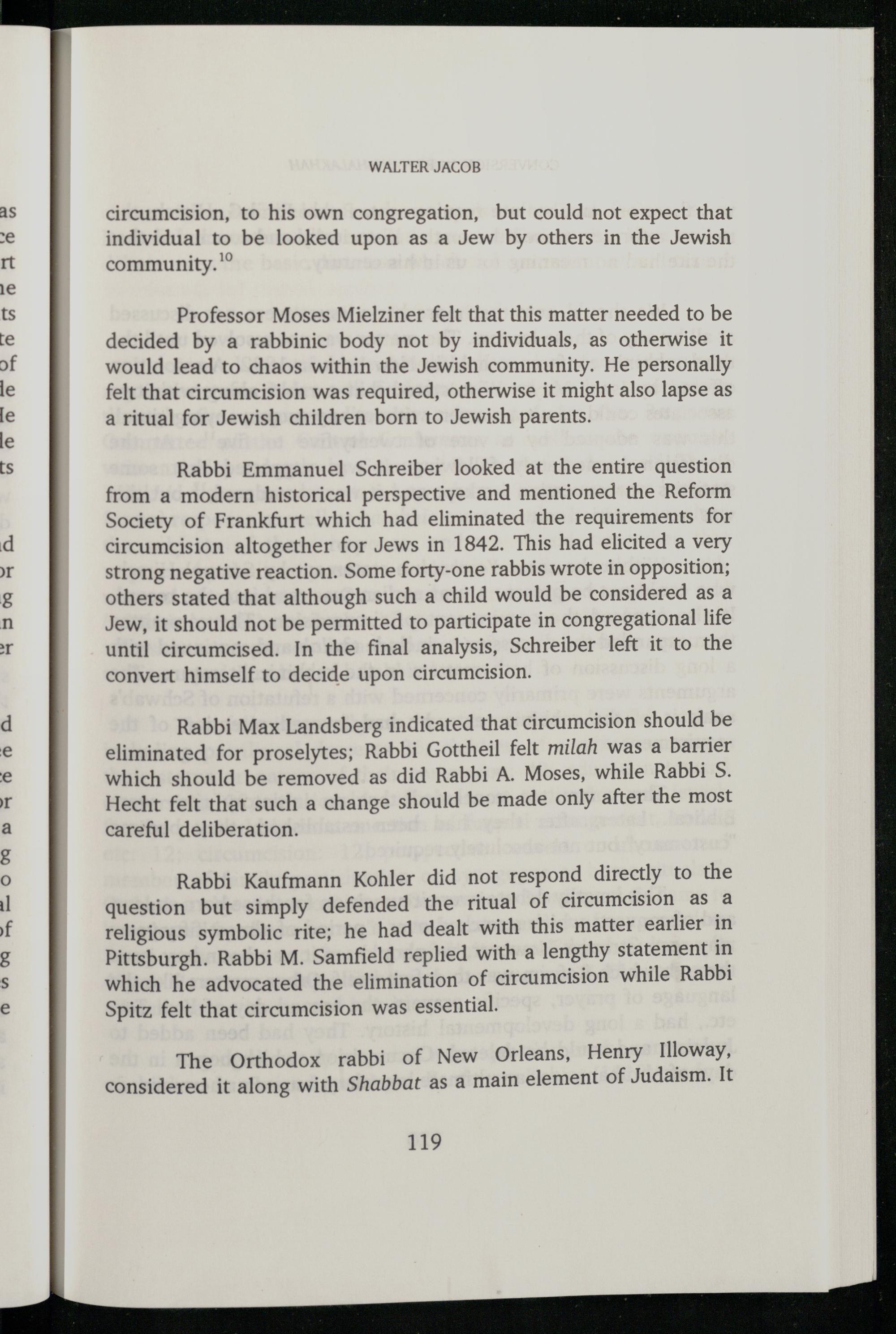 Professor Moses Mielziner felt that this matter needed to be decided by a rabbinic body not by individuals, as otherwise it would lead to chaos within the Jewish community. He personally felt that circumcision was required, otherwise it might also lapse as a ritual for Jewish children born to Jewish parents.