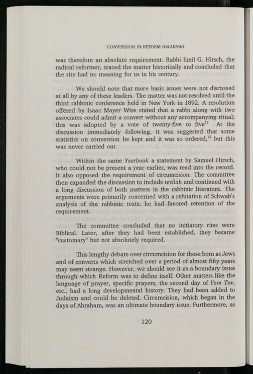 This lengthy debate over circumcision for those born as Jews and of converts which stretched over a period of almost fifty years may seem strange. However, we should see it as a boundary issue through which Reform was to define itself. Other matters like the language of prayer, specific prayers, the second day of Yom Tov, etc., had a long developmental history. They had been added to Judaism and could be deleted. Circumcision, which began in the days of Abraham , was an ultimate boundary issue. Furthermore, as