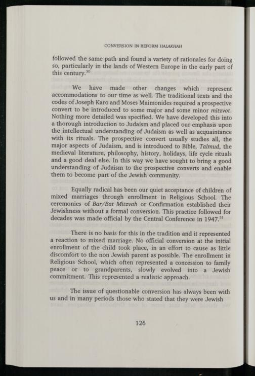 Equally radical has been our quiet acceptance of children of mixed marriages through enrollment in Religious School . The ceremonies of Bar/Bat Mitzvah or Confirmation established their Jewishness without a formal conversion. This practice followed for decades was made official by the Central Conference in 1947.