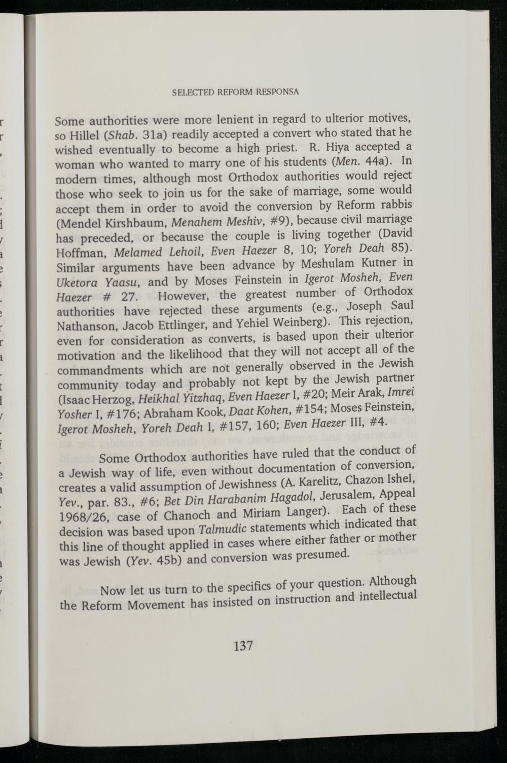 Some authorities were more lenient in regard to ulterior motives, so Hillel (Shab. 31a) readily accepted a convert who stated that he wished eventually to become a high priest. R. Hiya accepted a woman who wanted to marry one of his students(Men. 44a). In modern times, although most Orthodox authorities would reject those who seek to join us for the sake of marriage, some would accept them in order to avoid the conversion by Reform rabbis (Mendel Kirshbaum, Menahem Meshiv,#9), because civil marriage has preceded, or because the couple is living together(David Hoffman, Melamed Lehoil, Even Haezer 8, 10; Yoreh Deah 85). Similar arguments have been advance by Meshulam Kutner in Uketora Yaasu, and by Moses Feinstein in Igerot Mosheh, Even Haezer# 27. However, the greatest number of Orthodox authorities have rejected these arguments(e.g. Joseph Saul Nathanson , Jacob Ettlinger , and Yehiel Weinberg). This rejection, even for consideration as converts, is based upon their ulterior motivation and the likelihood that they will not accept all of the commandments which are not generally observed in the Jewish