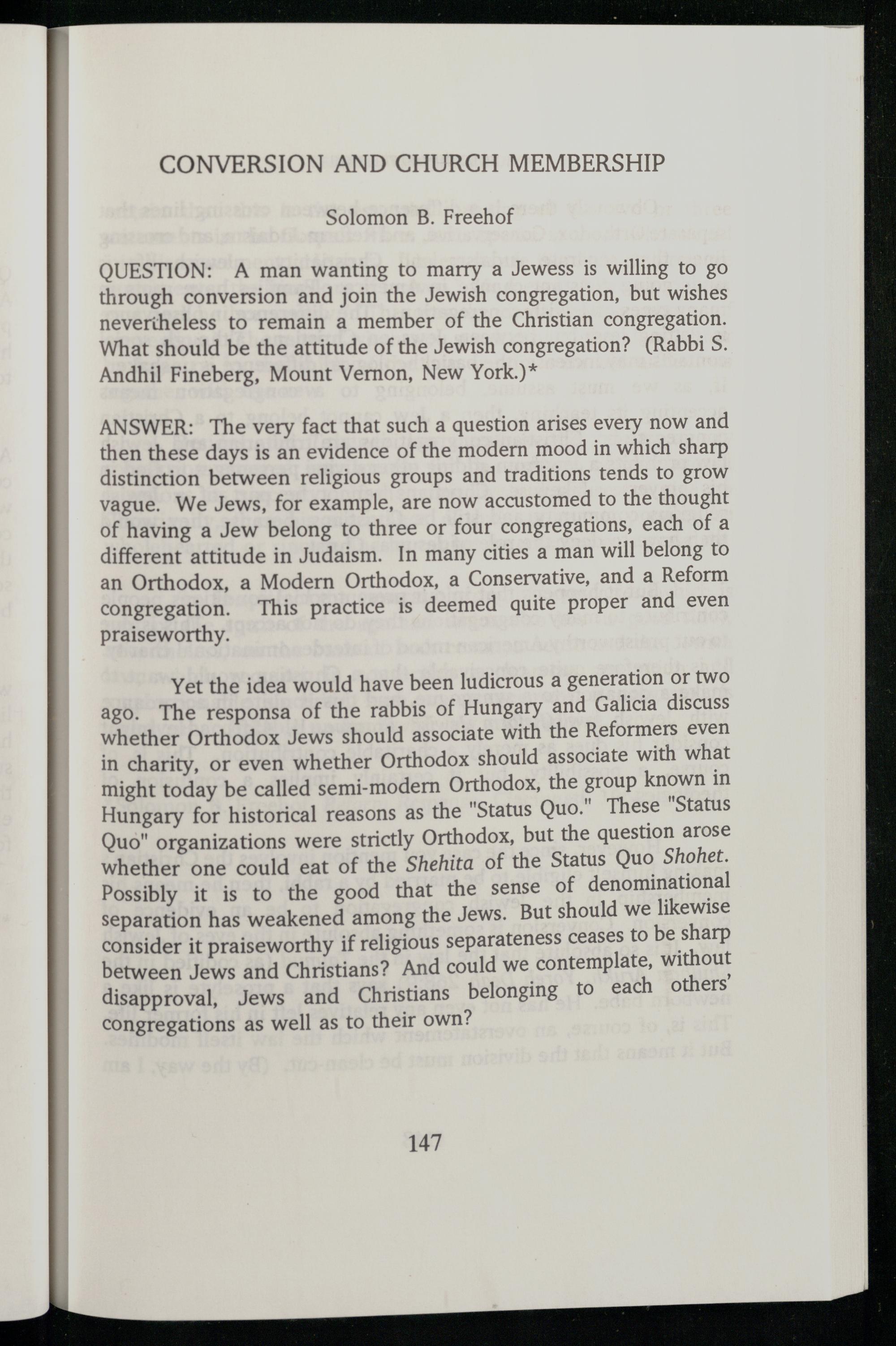 Hungary for historical reasons as the"Status Quo." These"Status Quo" organizations were strictly Orthodox , but the question arose whether one could eat of the Shehita of the Status Quo Shohet. Possibly it is to the good that the sense of denominational separation has weakened among the Jews . But should we likewise consider it praiseworthy if religious separateness ceases to be sharp between Jews and Christians? And could we contemplate, without disapproval, Jews and Christians belonging to each others congregations as well as to their own?