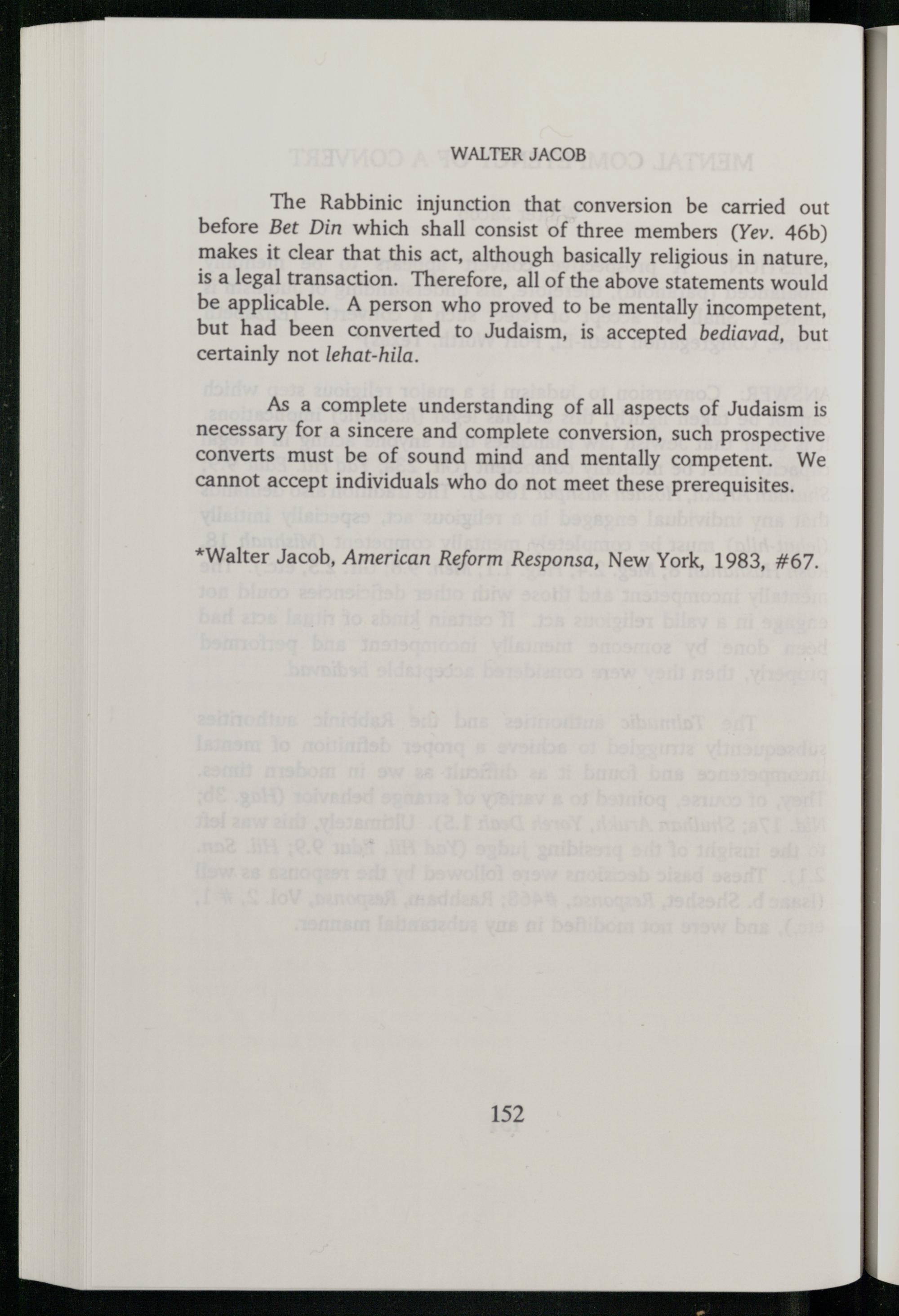 The Rabbinic injunction that conversion be carried out before Bet Din which shall consist of three members(Yev. 46b) makes it clear that this act, although basically religious in nature, is a legal transaction. Therefore, all of the above statements would be applicable. A person who proved to be mentally incompetent, but had been converted to Judaism , is accepted bediavad, but certainly not lehat-hila.