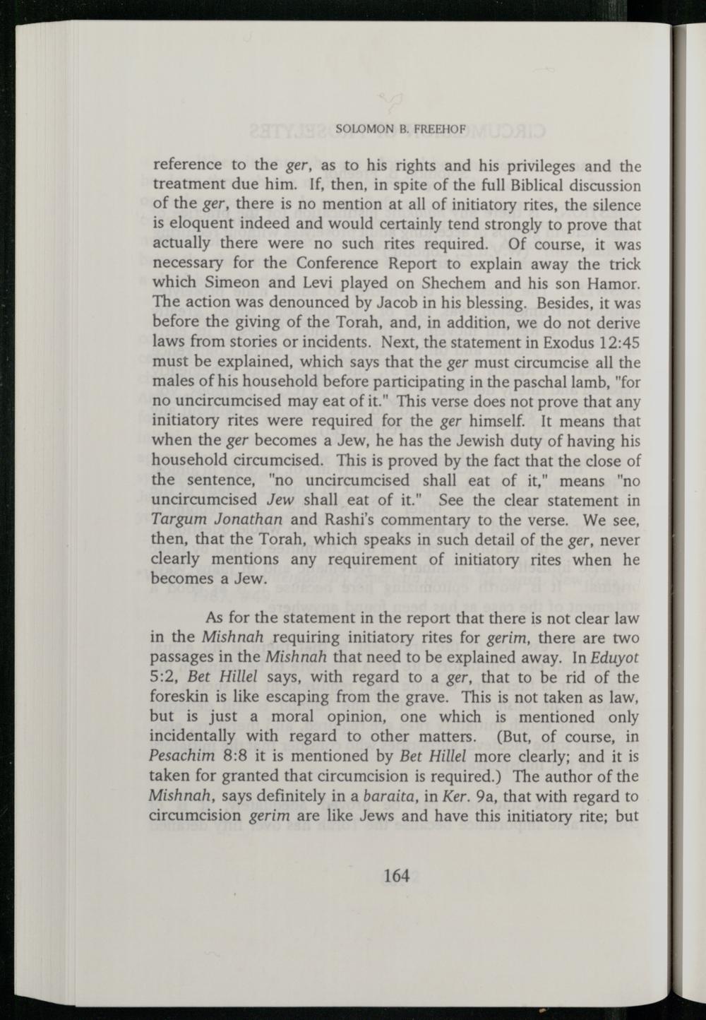 reference to the ger, as to his rights and his privileges and the treatment due him. If, then, in spite of the full Biblical discussion of the ger, there is no mention at all of initiatory rites, the silence is eloquent indeed and would certainly tend strongly to prove that actually there were no such rites required. Of course, it was necessary for the Conference Report to explain away the trick which Simeon and Levi played on Shechem and his son Hamor. The action was denounced by Jacob in his blessing. Besides, it was before the giving of the Torah , and, in addition, we do not derive laws from stories or incidents. Next, the statement in Exodus 12:45 must be explained, which says that the ger must circumcise all the males of his household before participating in the paschal lamb,"for no uncircumcised may eat of it." This verse does not prove that any initiatory rites were required for the ger himself. It means that when the ger becomes a Jew, he has the Jewish duty of having his household circumcised. This is proved by the fact that the close of the sentence,"no uncircumcised shall eat of it," means"no uncircumcised Jew shall eat of it." See the clear statement in