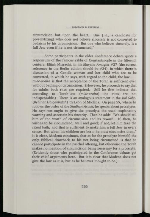 Some participants in the older Conference debate quote a responsum of the famous rabbi of Constantinople in the fifteenth century, Elijah Mizrachi , in his Mayyim Amuqgim#27(the correct reference in the Berlin edition should be#34), in which there is discussion of a Gentile woman and her child who are to be converted, in which he says, with regard to the child, the law mide-oraita is that the acceptance of the Torah is sufficient even without bathing or circumcision.(However, he proceeds to say that for adults both rites are required. Still he does indicate that according to Torah-law(mide-oraita) the rites are not indispensable.) There is an analogous statement in the Kol Sohol (Behinat Ha-qabbalah) by Leon of Modena . On page 59, where he follows the order of the Shulhan Arukh, he speaks about proselytes. He says we ought to give the proselyte the usual explanatory warning and ascertain his sincerity. Then he adds:"We should tell him of the worth of circumcision and its reward. If, then, he wishes to be circumcised, well and good; if not, let him take the ritual bath, and that is sufficient to make him a full Jew in every sense. But when his children are born, he must circumcise them." It is clear, Modena continues, that as for the proselyte himself, the only Biblical drawback to his not being circumcised is that he cannot participate in the paschal offering, but otherwise the Torah makes no mention of circumcision being necessary for a proselyte. (Evidently those who participated in the Conference debate got their chief arguments here. But it is clear that Modena does not give the law as it is, but as he believes it ought to be.)