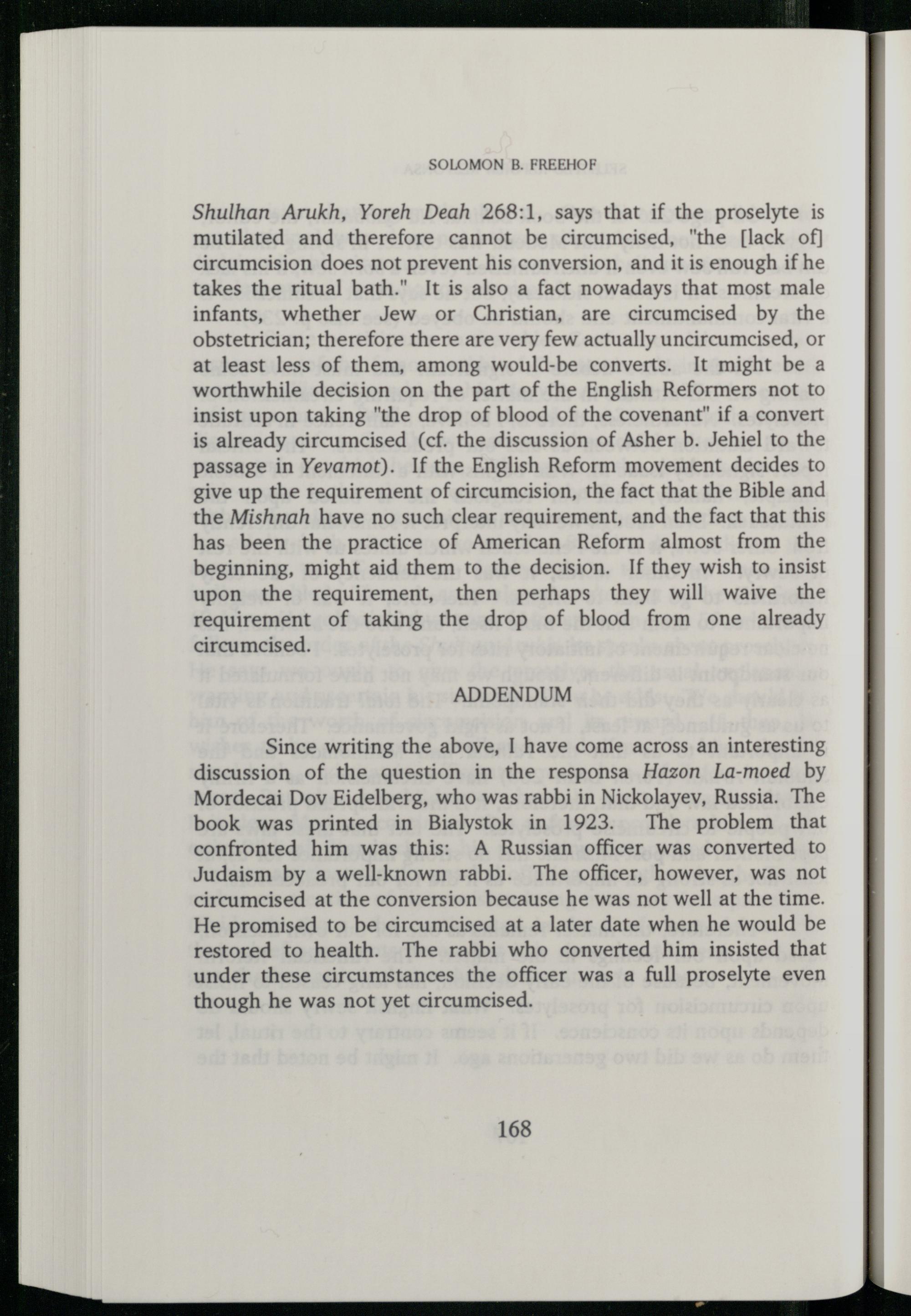 Shulhan Arukh, Yoreh Deah 268:1, says that if the proselyte is mutilated and therefore cannot be circumcised,"the[lack of] circumcision does not prevent his conversion, and it is enough if he takes the ritual bath." It is also a fact nowadays that most male infants, whether Jew or Christian, are circumcised by the obstetrician; therefore there are very few actually uncircumcised, or at least less of them, among would-be converts. It might be a worthwhile decision on the part of the English Reformers not to insist upon taking"the drop of blood of the covenant” if a convert is already circumcised(cf. the discussion of Asher b. Jehiel to the passage in Yevamot). If the English Reform movement decides to give up the requirement of circumcision, the fact that the Bible and the Mishnah have no such clear requirement, and the fact that this has been the practice of American Reform almost from the beginning, might aid them to the decision. If they wish to insist upon the requirement, then perhaps they will waive the requirement of taking the drop of blood from one already circumcised.