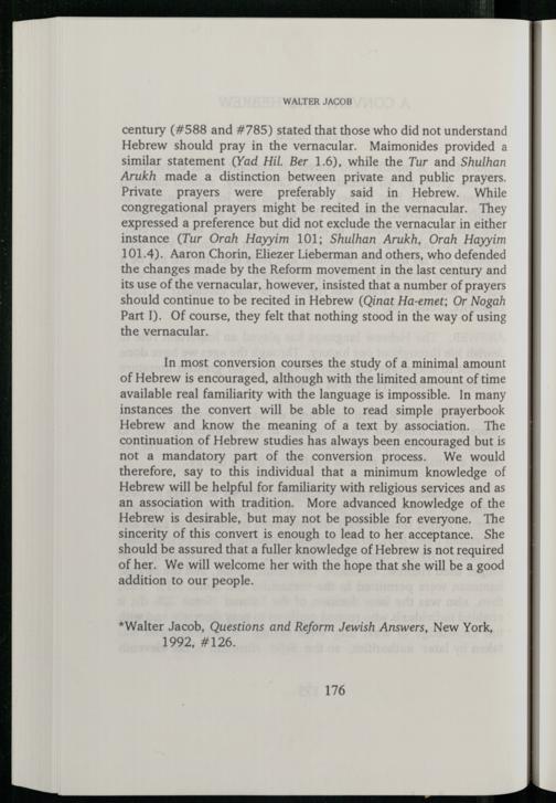 instances the convert will be able to read simple prayerbook Hebrew and know the meaning of a text by association. The continuation of Hebrew studies has always been encouraged but is not a mandatory part of the conversion process. We would therefore, say to this individual that a minimum knowledge of Hebrew will be helpful for familiarity with religious services and as an association with tradition. More advanced knowledge of the Hebrew is desirable, but may not be possible for everyone. The sincerity of this convert is enough to lead to her acceptance. She should be assured that a fuller knowledge of Hebrew is not required of her. We will welcome her with the hope that she will be a good addition to our people.