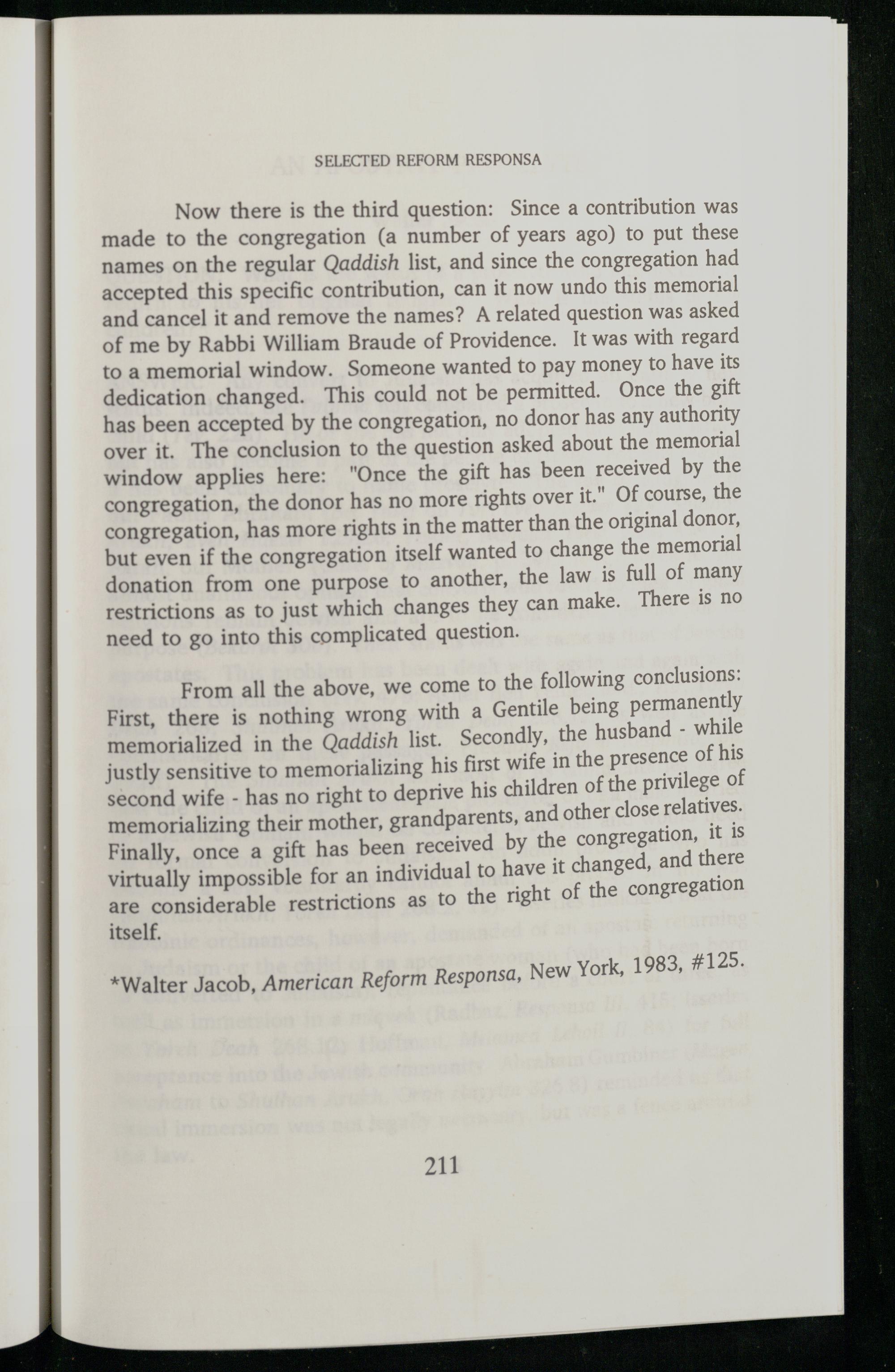 Now there is the third question: Since a contribution was made to the congregation(a number of years ago) to put these names on the regular Qaddish list, and since the congregation had accepted this specific contribution, can it now undo this memorial and cancel it and remove the names? A related question was asked of me by Rabbi William Braude of Providence. It was with regard to a memorial window. Someone wanted to pay money to have its dedication changed. This could not be permitted. Once the gift has been accepted by the congregation, no donor has any authority over it. The conclusion to the question asked about the memorial window applies here:"Once the gift has been received by the congregation, the donor has no more rights over it." Of course, the congregation, has more rights in the matter than the original donor, but even if the congregation itself wanted to change the memorial donation from one purpose to another, the law is full of many restrictions as to just which changes they can make. There is no need to go into this complicated question.