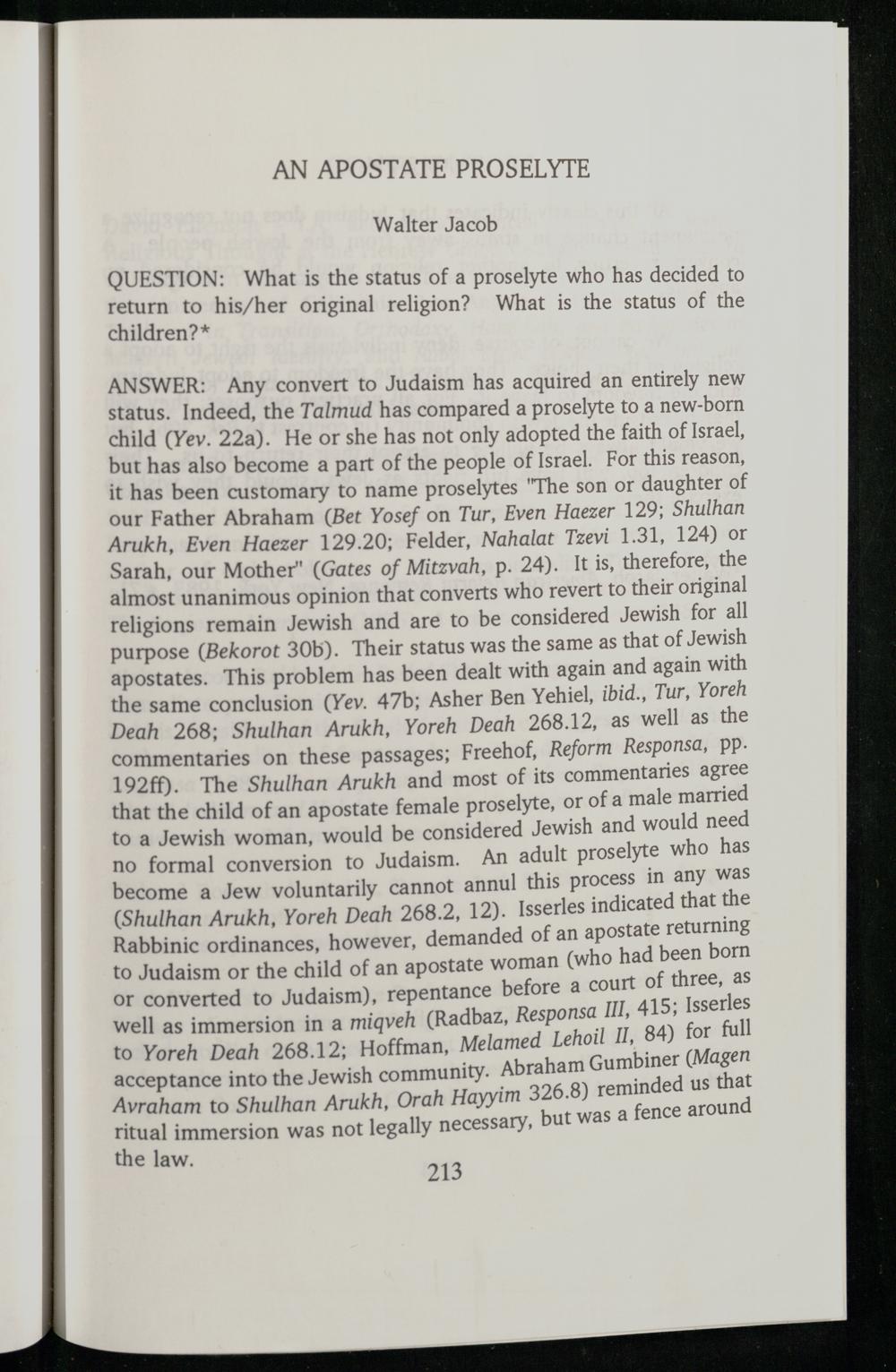ANSWER: Any convert to Judaism has acquired an entirely new status. Indeed, the Talmud has compared a proselyte to a new-born child(Yev. 22a). He or she has not only adopted the faith of Israel , but has also become a part of the people of Israel . For this reason, it has been customary to name proselytes"The son or daughter of our Father Abraham(Bet Yosef on Tur, Even Haezer 129; Shulhan Arukh, Even Haezer 129.20; Felder, Nahalat Tzevi 1.31, 124) or Sarah, our Mother"(Gates of Mitzvah, p. 24). Itis, therefore, the almost unanimous opinion that converts who revert to their original religions remain Jewish and are to be considered Jewish for all purpose(Bekorot 30b). Their status was the same as that of Jewish apostates. This problem has been dealt with again and again with the same conclusion(Yev. 47b; Asher Ben Yehiel , ibid., Tur, Yoreh Deah 268: Shulhan Arukh, Yoreh Deah 268.12, as well as the commentaries on these passages; Freehof , Reform Responsa, Pp: 192ff). The Shulhan Arukh and most of its commentaries agree that the child of an apostate female proselyte, or of a male married to a Jewish woman, would be considered Jewish and would need no formal conversion to Judaism . An adult proselyte who has become a Jew voluntarily cannot annul this process in any was (Shulhan Arukh, Yoreh Deah 268.2, 12). Isserles indicated that the Rabbinic ordinances, however, demanded of an apostate returning to Judaism or the child of an apostate woman(who had been born or converted to Judaism ), repentance before a court of hres; well as immersion in a miqveh(Radbaz , Responsd 11, 415; ers to Yoreh Deah 268.12; Hoffman, Melamed Lehoil II, 84) Te sa acceptance into the Jewish community. Abraham Cushing i x Avraham to Shulhan Arukh, Orah Hayyim 326.8) reminded U go ritual immersion was not legally necessary, but was a fence aro