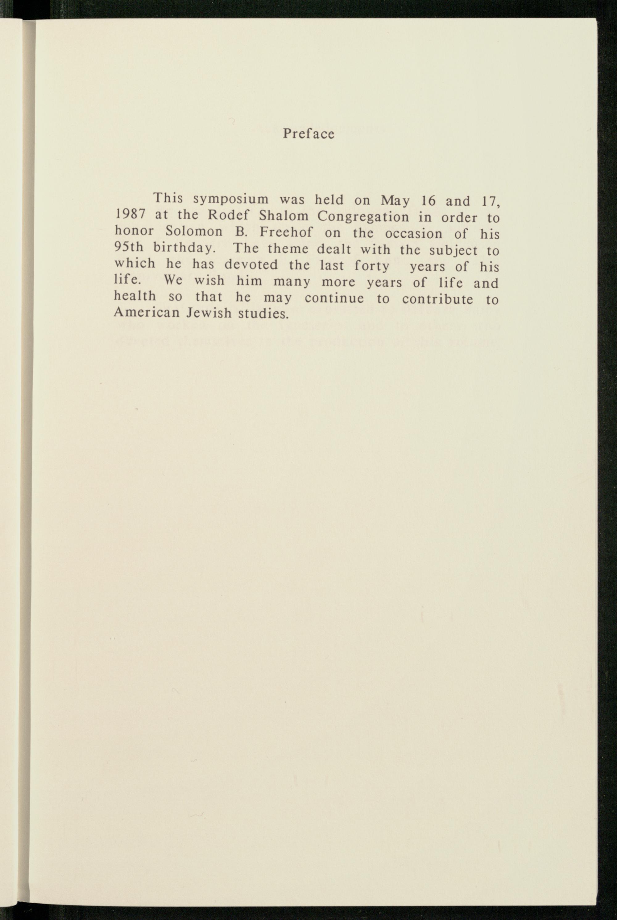 This symposium was held on May 16 and 17, 1987 at the Rodef Shalom Congregation in order to honor Solomon B. Freehof on the occasion of his 95th birthday. The theme dealt with the subject to which he has devoted the last forty years of his life. We wish him many more years of life and health so that he may continue to contribute to American Jewish studies.