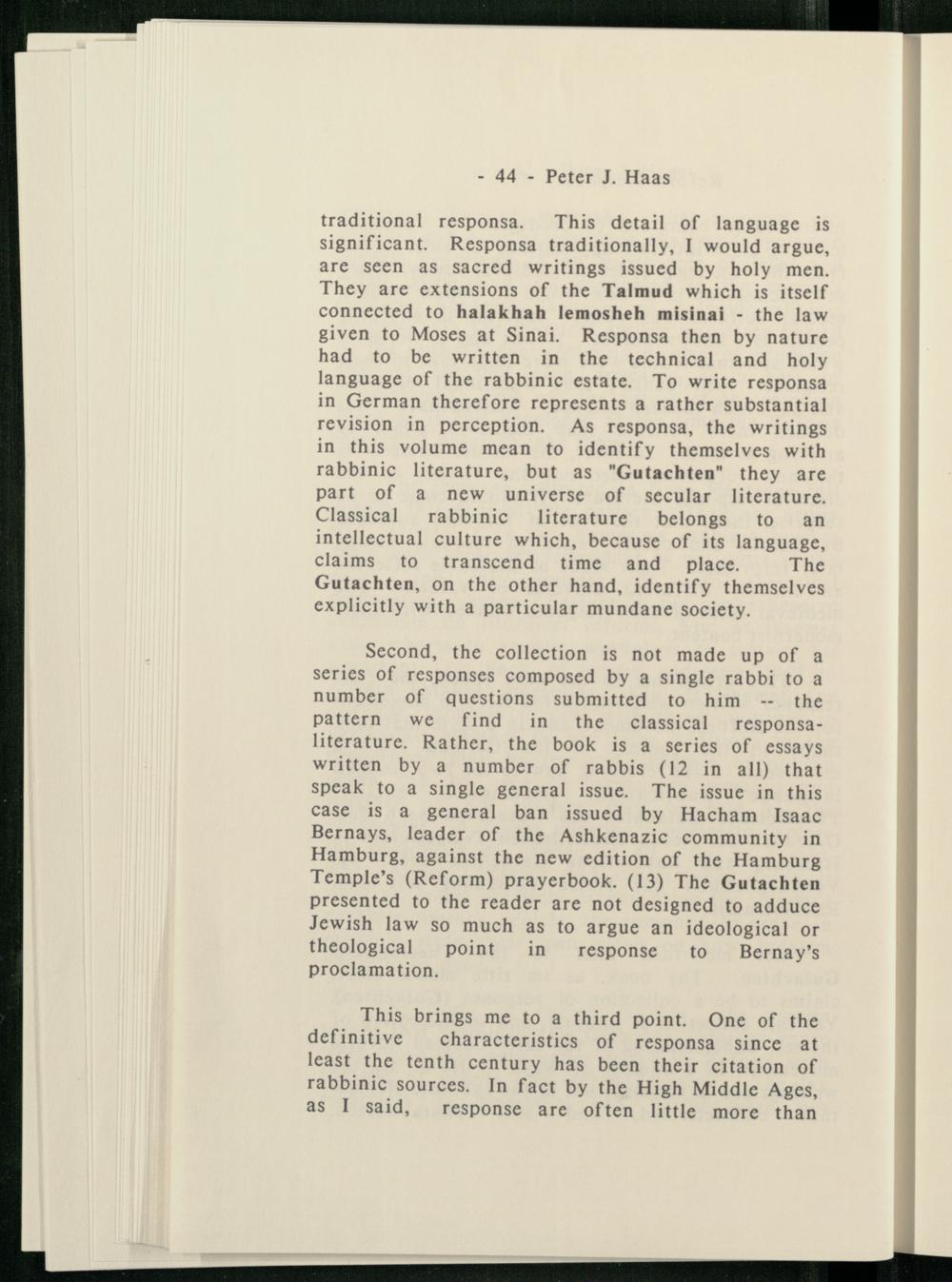 Second, the collection is not made up of a series of responses composed by a single rabbi to a number of questions submitted to him-- the pattern we find in the classical responsaliterature. Rather, the book is a series of essays written by a number of rabbis 12 in all) that speak to a single general issue. The issue in this case is a general ban issued by Hacham Isaac Bernays , leader of the Ashkenazic community in Hamburg , against the new edition of the Hamburg Temple ’s(Reform) prayerbook.(13) The Gutachten presented to the reader are not designed to adduce Jewish law so much as to argue an ideological or theological point in response to Bernay’s proclamation.