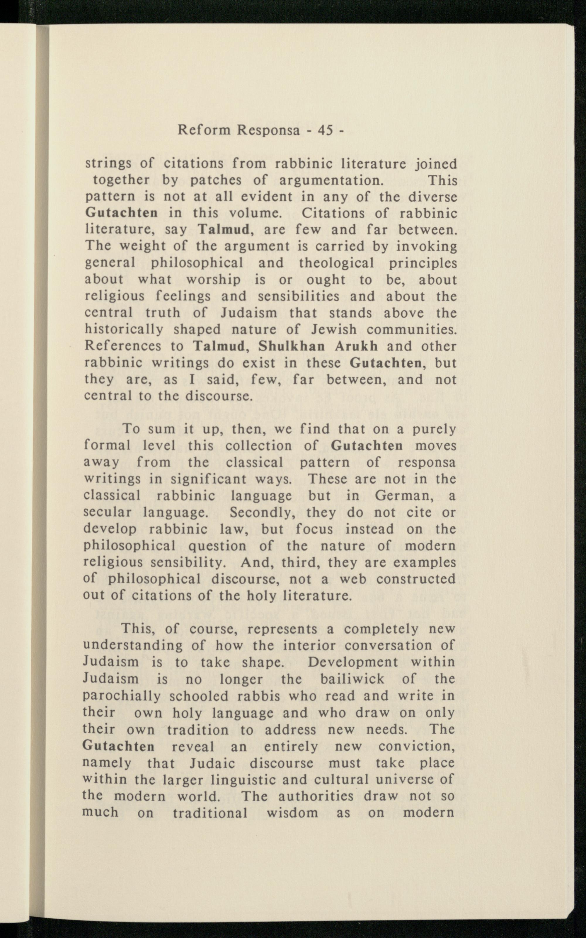 To sum it up, then, we find that on a purely formal level this collection of Gutachtem moves away from the classical pattern of responsa writings in significant ways. These are not in the classical rabbinic language but in German, a secular language. Secondly, they do not cite or develop rabbinic law, but focus instead on the philosophical question of the nature of modern religious sensibility. And, third, they are examples of philosophical discourse, not a web constructed out of citations of the holy literature.