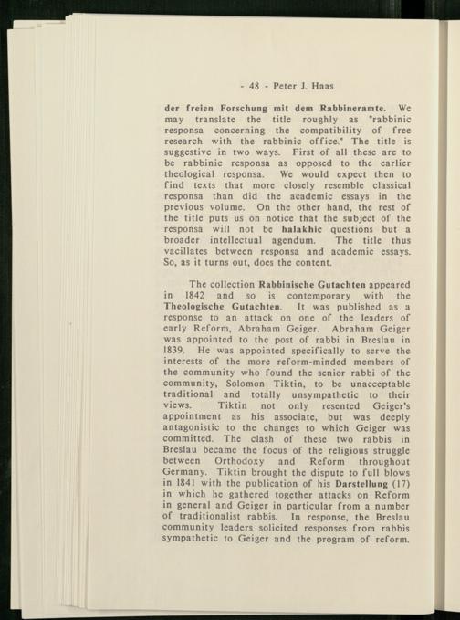 The collection Rabbinische Gutachten appeared in 1842 and so is contemporary with the Theologische Gutachten. It was published as a response to an attack on one of the leaders of early Reform, Abraham Geiger . Abraham Geiger was appointed to the post of rabbi in Breslau in 1839. He was appointed specifically to serve the interests of the more reform-minded members of the community who found the senior rabbi of the community, Solomon Tiktin, to be unacceptable traditional and totally unsympathetic to their views. Tiktin not only resented Geiger ’s appointment as his associate, but was deeply antagonistic to the changes to which Geiger was committed. The clash of these two rabbis in Breslau became the focus of the religious struggle between Orthodoxy and Reform throughout Germany . Tiktin brought the dispute to full blows in 1841 with the publication of his Darstellung(17) in which he gathered together attacks on Reform in general and Geiger in particular from a number of traditionalist rabbis. In response, the Breslau community leaders solicited responses from rabbis sympathetic to Geiger and the program of reform.