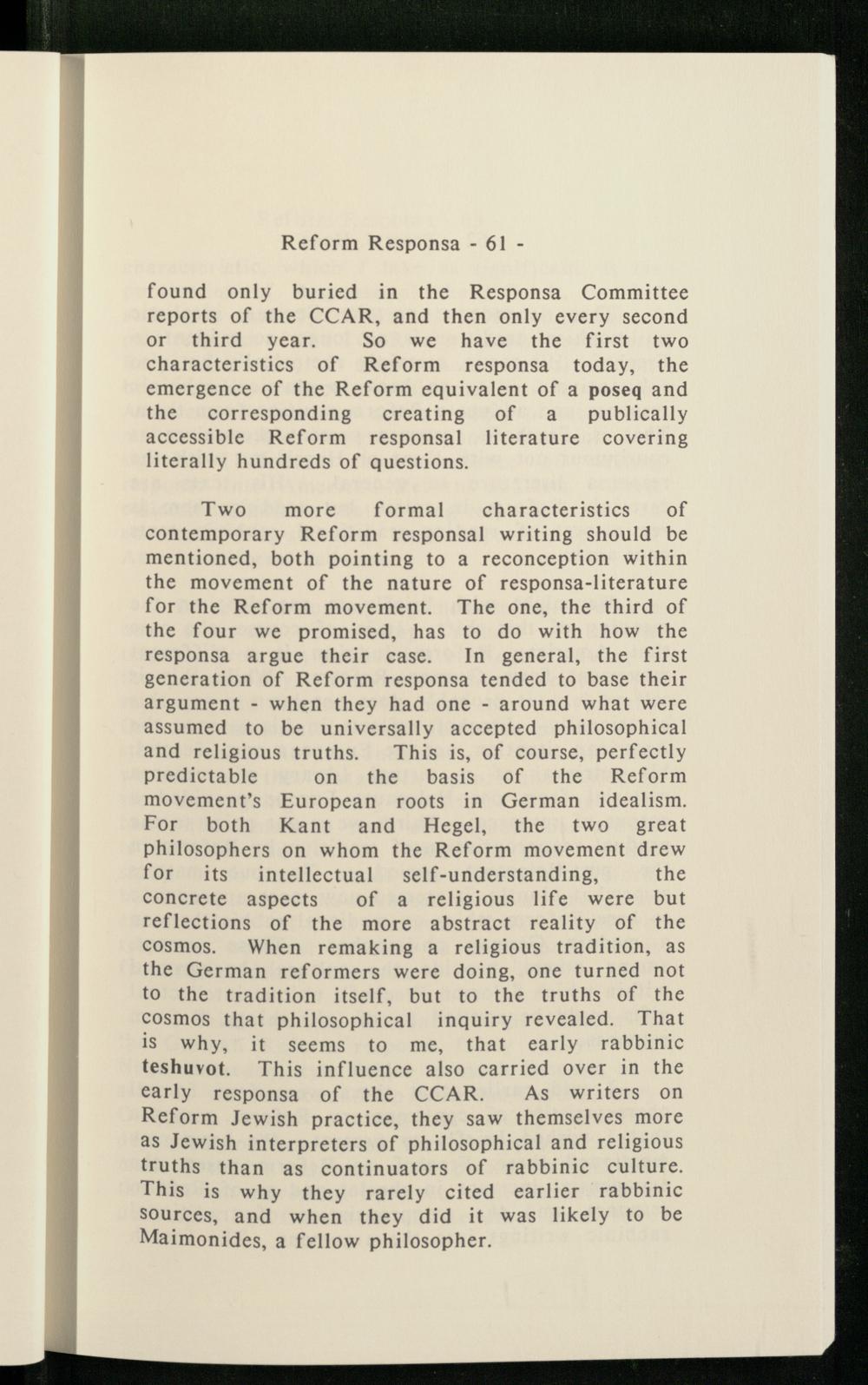 Two more formal characteristics of contemporary Reform responsal writing should be mentioned, both pointing to a reconception within the movement of the nature of responsa-literature for the Reform movement. The one, the third of the four we promised, has to do with how the responsa argue their case. In general, the first generation of Reform responsa tended to base their argument- when they had one- around what were assumed to be universally accepted philosophical and religious truths. This is, of course, perfectly predictable on the‘basis of ithe! Reform movement’s European roots in German idealism. For both Kant and Hegel , the two great philosophers on whom the Reform movement drew for its intellectual self-understanding, the concrete aspects of a religious life were but reflections of the more abstract reality of the cosmos. When remaking a religious tradition, as the German reformers were doing, one turned not to the tradition itself, but to the truths of the cosmos that philosophical inquiry revealed. That is why, it seems to me, that early rabbinic teshuvot. This influence also carried over in the early responsa of the CCAR. As writers on Reform Jewish practice, they saw themselves more as Jewish interpreters of philosophical and religious truths than as continuators of rabbinic culture. This is why they rarely cited earlier rabbinic sources, and when they did it was likely to be Maimonides , a fellow philosopher .