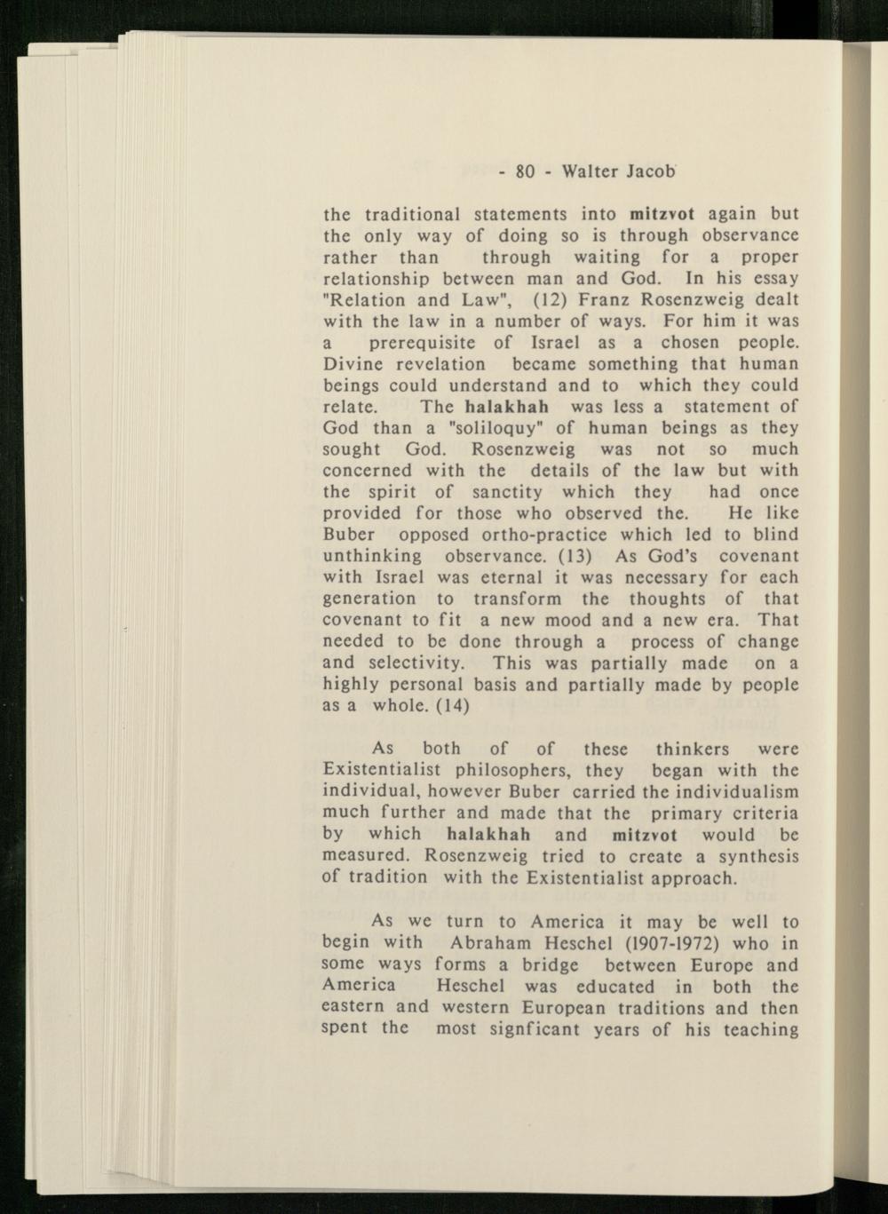 the traditional statements into mitzvot again but the only way of doing so is through observance rather than through waiting for a proper relationship between man and God . In his essay "Relation and Law",(12) Franz Rosenzweig dealt with the law in a number of ways. For him it was a prerequisite of Israel as a chosen people. Divine revelation became something that human beings could understand and to which they could relate. The halakhah was less a statement of God than a"soliloquy" of human beings as they sought God . Rosenzweig was not so much concerned with the details of the law but with the spirit of sanctity which they had once provided for those who observed the. He like Buber opposed ortho-practice which led to blind unthinking observance.(13) As God ’s covenant with Israel was eternal it was necessary for each generation to transform the thoughts of that covenant to fit a new mood and a new era. That needed to be done through a process of change and selectivity. This was partially made on a highly personal basis and partially made by people as a whole.(14)