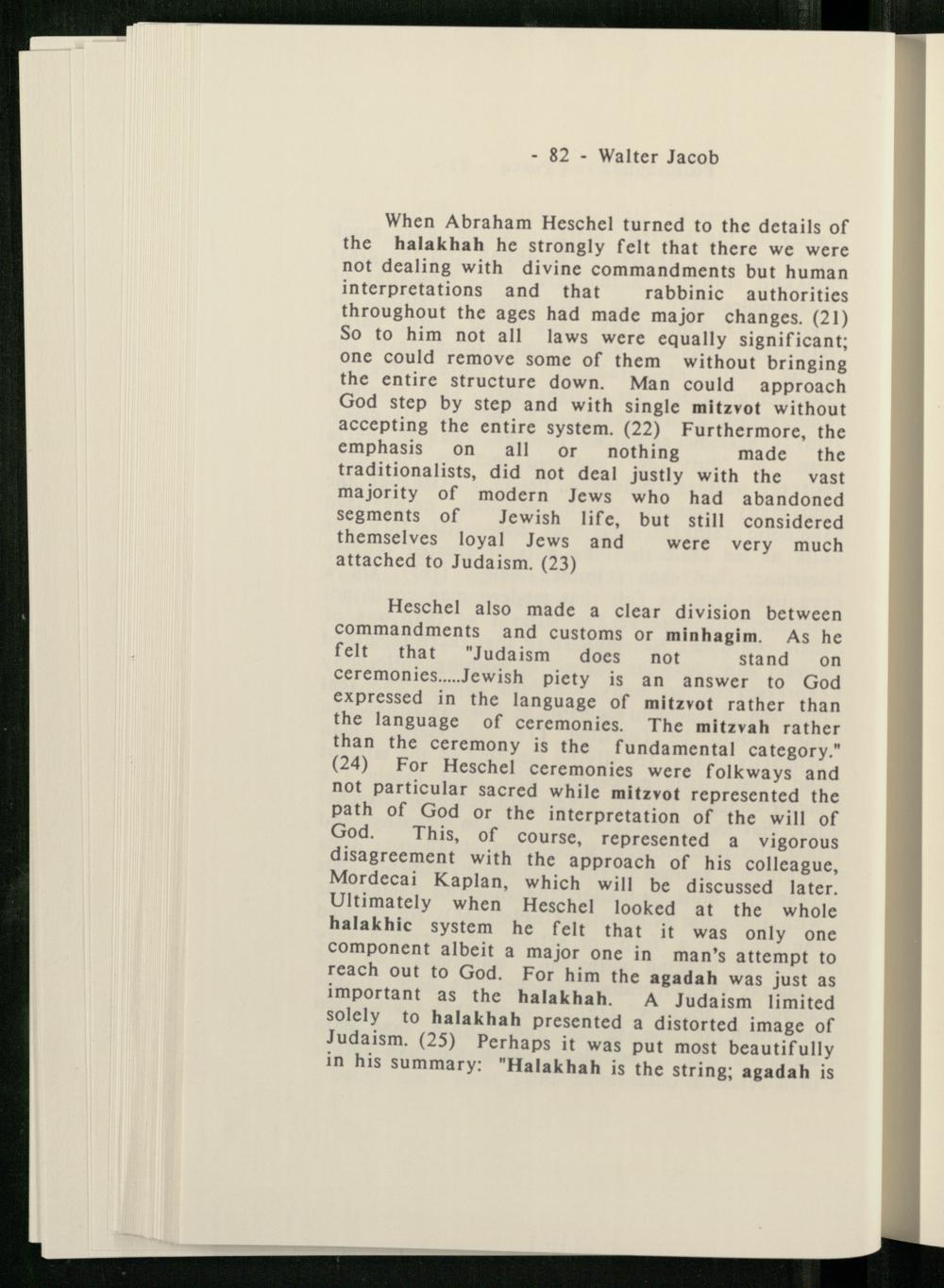 Heschel also made a clear division between commandments and customs or minhagim. As he felt that"Judaism does not stand on ceremonies...Jewish piety is an answer to God expressed in the language of mitzvot rather than the language of ceremonies. The mitzvah rather than the ceremony is the fundamental category." (24) For Heschel ceremonies were folkways and not particular sacred while mitzvot represented the path of God or the interpretation of the will of God . This, of course, represented a vigorous disagreement with the approach of his colleague , Mordecai Kaplan , which will be discussed later. Ultimately when Heschel looked at the whole halakhic system he felt that it was only one component albeit a major one in man’s attempt to reach out to God . For him the agadah was just as important as the halakhah. A Judaism limited solely to halakhah presented a distorted image of Judaism. (25) Perhaps it was put most beautifully in his summary:"Halakhah is the string ; agadah is