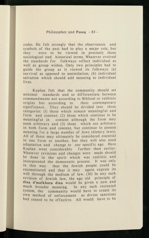 Kaplan felt that the community should set minimal standards and so differentiate between commandments not according to Biblical or rabbinic origins but according to their contemporary significance. They should be divided into three categories:(1) those which remain meaningful and form and content;(2) those which continue to be meaningful in content although the form may seem arbitrary and(3) those which are arbitrary in both form and content, but continue to possess meaning for a large number of Jews (dietary laws). All of these may ultimately be considered essential in one form or another, but they will also need adaptation and change to our specific age. Here Kaplan went considerably further than earlier. Whatever revisions and changes were made should be done in the spirit which was realistic and incorporated the democratic process. It was only in this way that the Jewish people could be reconstituted and that it may again express its will through the medium of law.(30) In any such revision of Jewish law, the age old principle of dina d’malkhuta dina would be given a new and much broader meaning. In any such recreated System, the community would have to create its own method of enforcement as divine sanctions had ceased to be effective. All would have to be