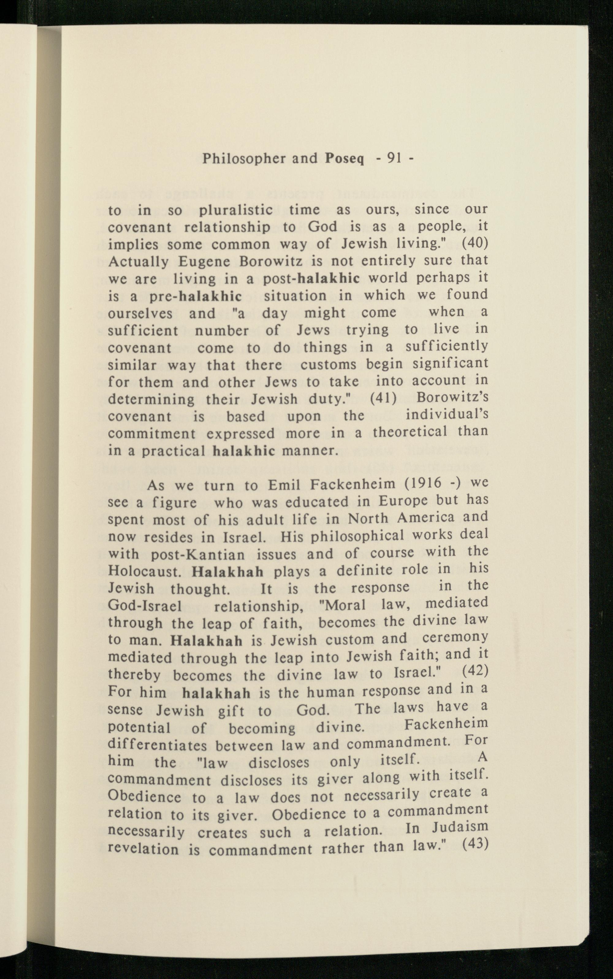 As we turn to Emil Fackenheim (1916-) we see a figure who was educated in Europe but has spent most of his adult life in North America and now resides in Israel . His philosophical works deal with post-Kantian issues and of course with the Holocaust . Halakhah plays a definite role in his Jewish thought. It is the response in. the God -Israel relationship,"Moral law, mediated through the leap of faith, becomes the divine law to man. Halakhah is Jewish custom and ceremony mediated through the leap into Jewish faith; and it thereby becomes the divine law to Israel ’(42) For him halakhah is the human response and in a sense Jewish gift to God . The laws have a