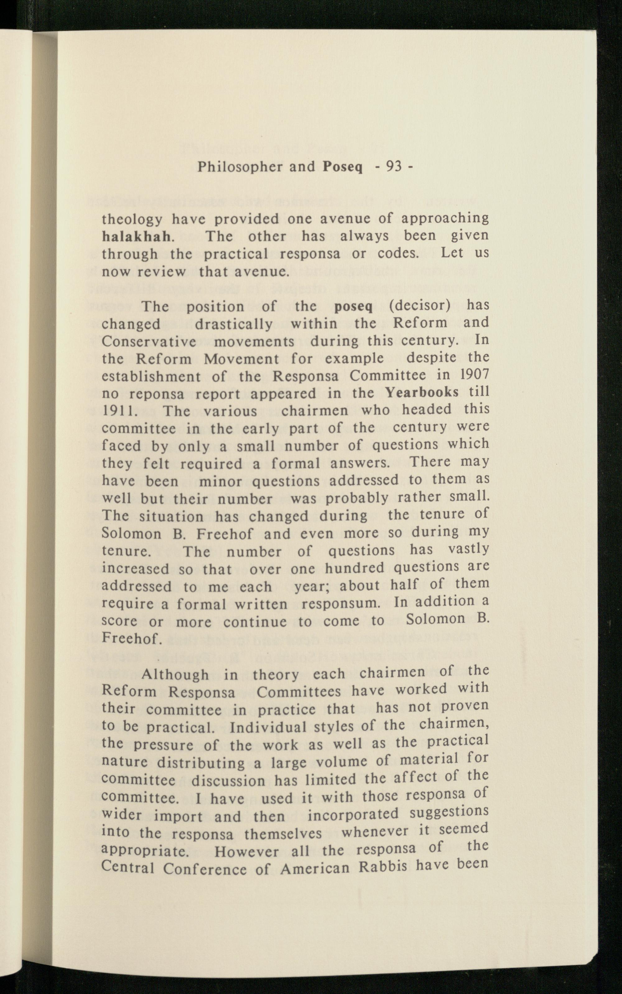The position of the poseq(decisor) has changed drastically within the Reform and Conservative movements during this century. In the Reform Movement for example despite the establishment of the Responsa Committee in 1907 no reponsa report appeared in the Yearbooks till 1911. The various chairmen who headed this committee in the early part of the century were faced by only a small number of questions which they felt required a formal answers. There may have been minor questions addressed to them as well but their number was probably rather small. The situation has changed during the tenure of Solomon B. Freechof and even more so during my tenure. The number of questions has vastly increased so that over one hundred questions are addressed to me each year; about half of them require a formal written responsum. In addition a score or more continue to come to Solomon B. Freehof .