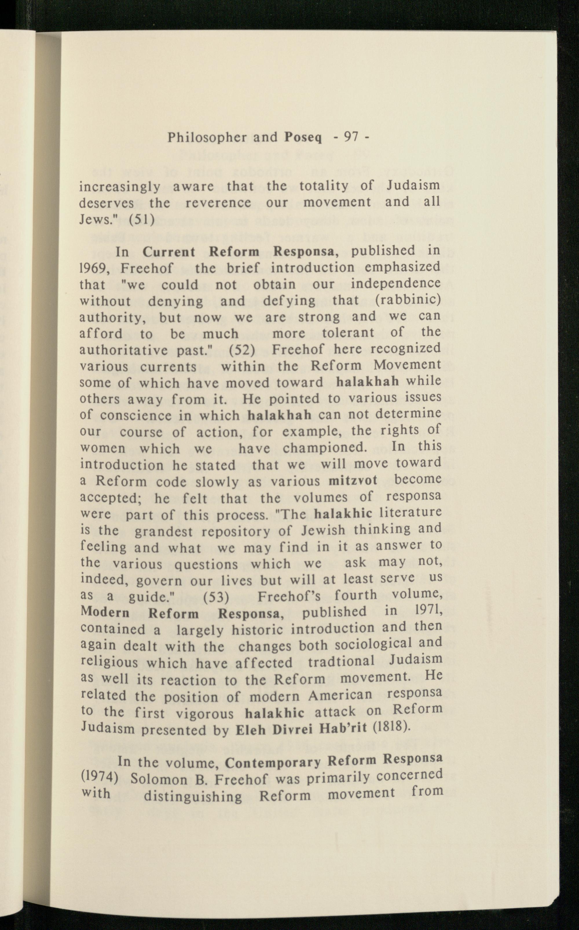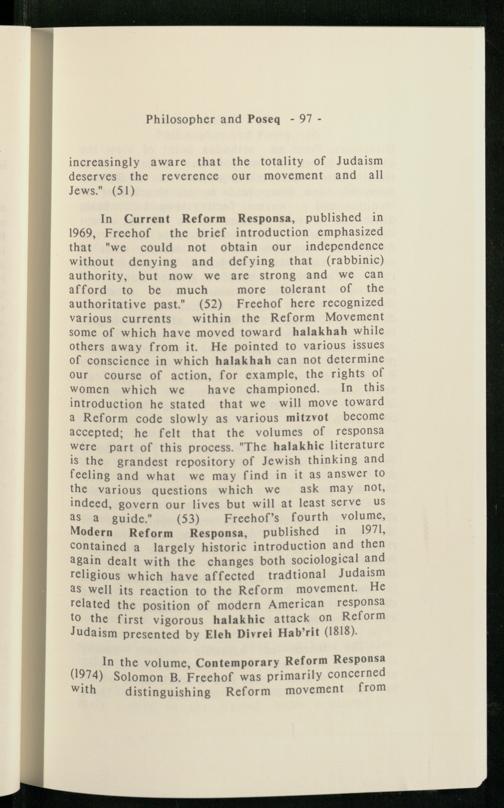 In Current Reform Responsa, published in 1969, Freehof the brief introduction emphasized that"we could not obtain our independence without denying and defying that(rabbinic) authority, but now we are strong and we can afford to be much more tolerant of the authoritative past."(52) Freehof here recognized various currents within the Reform Movement some of which have moved toward halakhah while others away from it. He pointed to various issues of conscience in which halakhah can not determine our course of action, for example, the rights of women which we have championed. In this introduction he stated that we will move toward a Reform code slowly as various mitzvot become accepted; he felt that the volumes of responsa were part of this process."The halakhic literature is the grandest repository of Jewish thinking and feeling and what we may find in it as answer to the various questions which we ask may not, indeed, govern our lives but will at least serve us as a guide."(53) Freehof ’s fourth volume, Modern Reform Responsa, published in 1971, contained a largely historic introduction and then again dealt with the changes both sociological and religious which have affected tradtional Judaism as well its reaction to the Reform movement. He related the position of modern American responsa to the first vigorous halakhic attack on Reform Judaism presented by Eleh Divrei Hab’rit(1818).