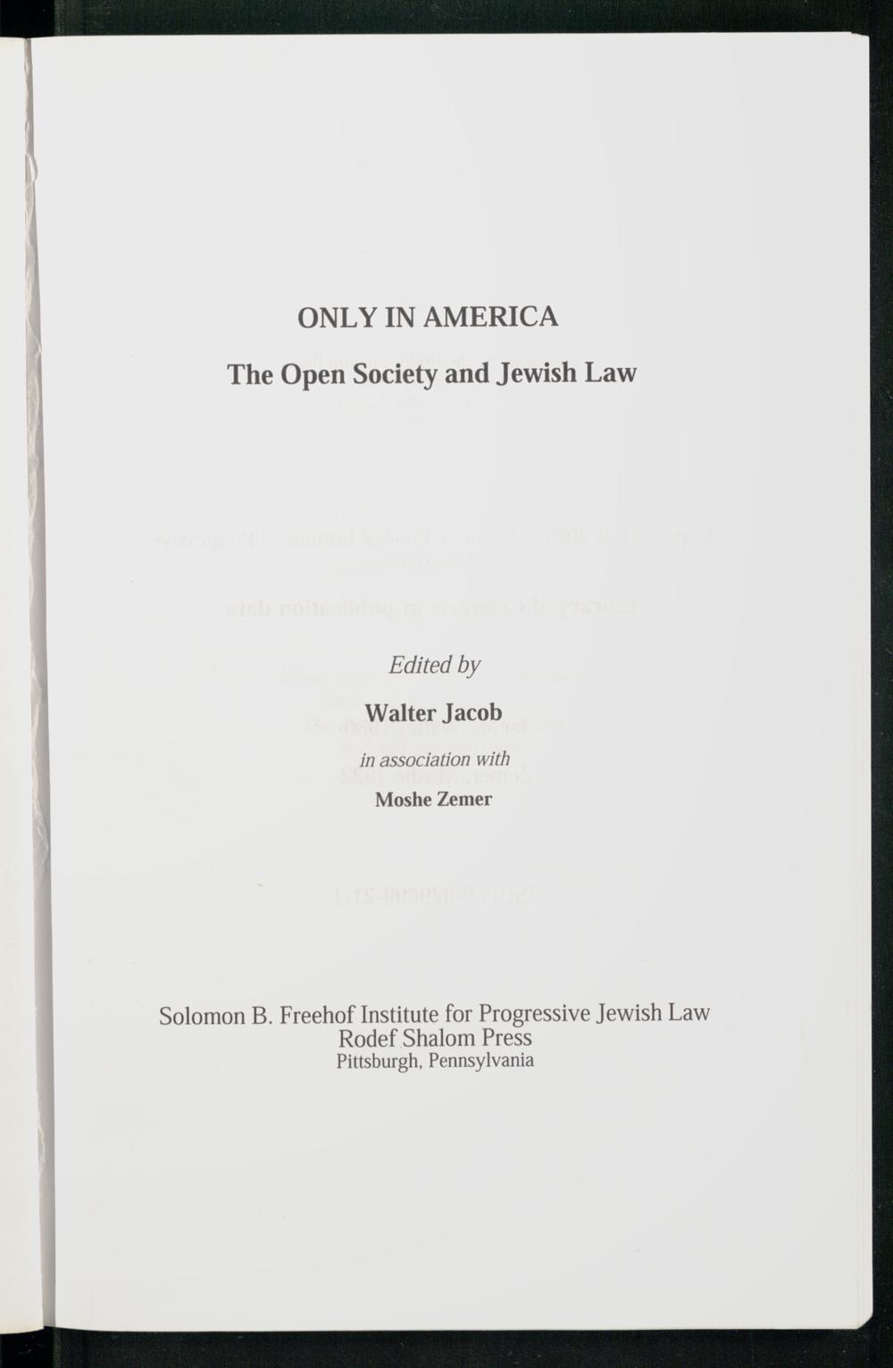 ONLY IN AMERICA The Open Society and Jewish Law Edited by Walter Jacob in association with Moshe Zemer Solomon B. Freehof Institute for Progressive Jewish Law Rodef Shalom Press Pittsburgh , Pennsylvania