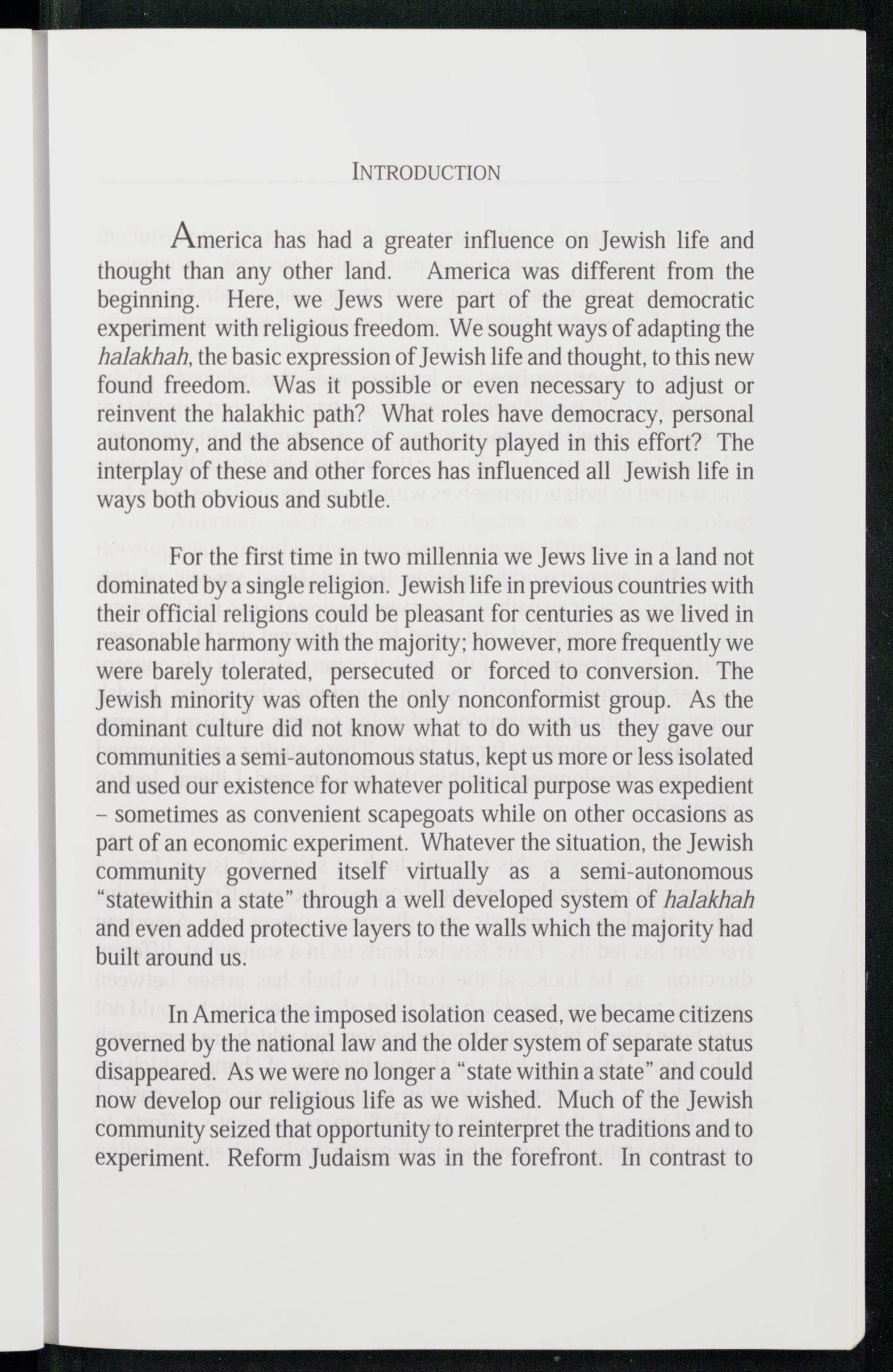 America has had a greater influence on Jewish life and thought than any other land.=~ America was different from the beginning. Here, we Jews were part of the great democratic experiment with religious freedom. We sought ways of adapting the halakhah, the basic expression of Jewish life and thought, to this new found freedom. Was it possible or even necessary to adjust or reinvent the halakhic path? What roles have democracy, personal autonomy, and the absence of authority played in this effort? The interplay of these and other forces has influenced all Jewish life in ways both obvious and subtle.
