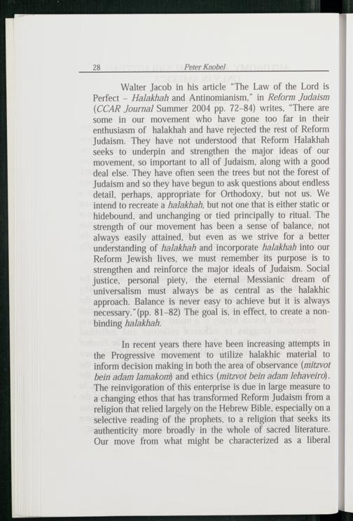 Walter Jacob in his article“The Law of the Lord is Perfect— Halakhah and Antinomianism, ” in Reform Judaism (CCAR Journal Summer 2004 pp. 72-84) writes,“There are some in our movement who have gone too far in their enthusiasm of halakhah and have rejected the rest of Reform Judaism . They have not understood that Reform Halakhah seeks to underpin and strengthen the major ideas of our movement, so important to all of Judaism , along with a good deal else. They have often seen the trees but not the forest of Judaism and so they have begun to ask questions about endless detail, perhaps, appropriate for Orthodoxy, but not us. We intend to recreate a halakhah, but not one that is either static or hidebound, and unchanging or tied principally to ritual. The strength of our movement has been a sense of balance, not always easily attained, but even as we strive for a better understanding of halakhah and incorporate halakhah into our Reform Jewish lives, we must remember its purpose is to strengthen and reinforce the major ideals of Judaism . Social justice, personal piety, the eternal Messianic dream of universalism must always be as central as the halakhic approach. Balance is never easy to achieve but it is always necessary.”(pp. 81-82) The goal is, in effect, to create a nonbinding halakhah.