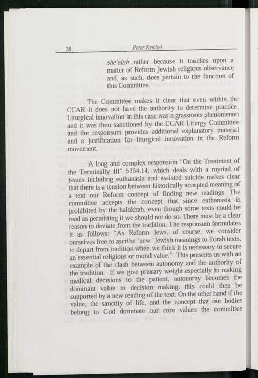 A long and complex responsum“On the Treatment of the Terminally III” 5754.14, which deals with a myriad of issues including euthanasia and assisted suicide makes clear that there is a tension between historically accepted meaning of a text our Reform concept of finding new readings. The committee accepts the concept that since euthanasia is prohibited by the halakhah, even though some texts could be read as permitting it we should not do so. There must be a clear reason to deviate from the tradition. The responsum formulates it as follows:“As Reform Jews, of course, we consider ourselves free to ascribe‘new’ Jewish meanings to Torah texts, to depart from tradition when we think it is necessary to secure an essential religious or moral value.” This presents us with an example of the clash between autonomy and the authority of the tradition. If we give primary weight especially in making medical decisions to the patient, autonomy becomes the dominant value in decision making, this could then be supported by a new reading of the text. On the other hand if the value, the sanctity of life, and the concept that our bodies belong to God dominate our core values the committee