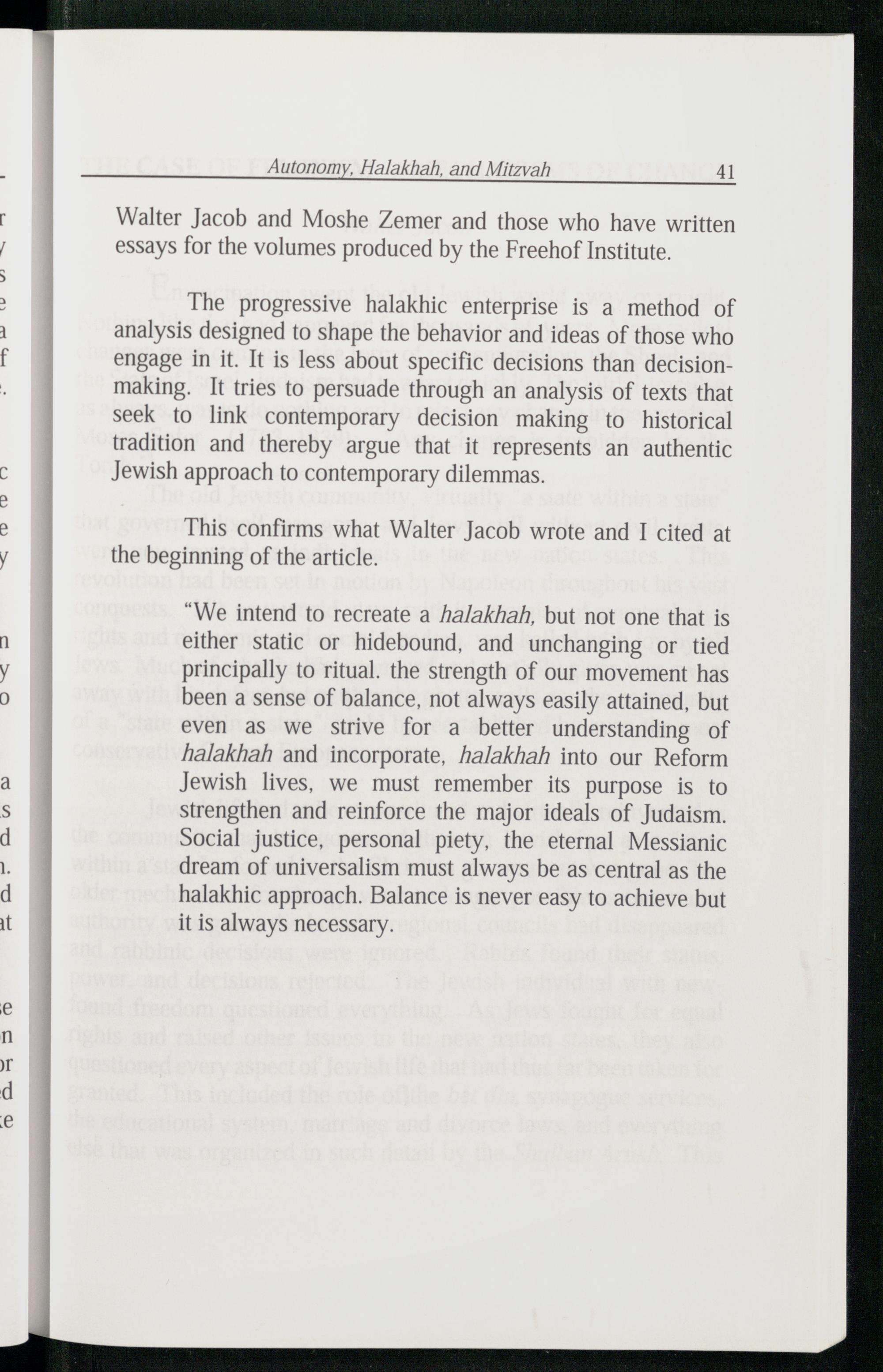“We intend to recreate a halakhah, but not one that is either static or hidebound, and unchanging or tied principally to ritual. the strength of our movement has been a sense of balance, not always easily attained, but even as we strive for a better understanding of halakhah and incorporate, halakhah into our Reform Jewish lives, we must remember its purpose is to strengthen and reinforce the major ideals of Judaism . Social justice, personal piety, the eternal Messianic dream of universalism must always be as central as the halakhic approach. Balance is never easy to achieve but it is always necessary.