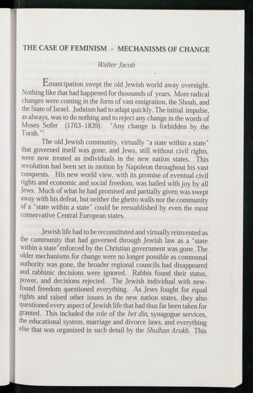 Jewish life had to be reconstituted and virtually reinvented as the community that had governed through Jewish law as a“state within a state” enforced by the Christian government was gone. The older mechanisms for change were no longer possible as communal authority was gone, the broader regional councils had disappeared and rabbinic decisions were ignored. Rabbis found their status, power, and decisions rejected. The Jewish individual with newfound freedom questioned everything. As Jews fought for equal rights and raised other issues in the new nation states, they also questioned every aspect of Jewish life that had thus far been taken for granted. This included the role of the bet din, synagogue services, the educational system, marriage and divorce laws, and everything else that was organized in such detail by the Shulhan Arukh. This