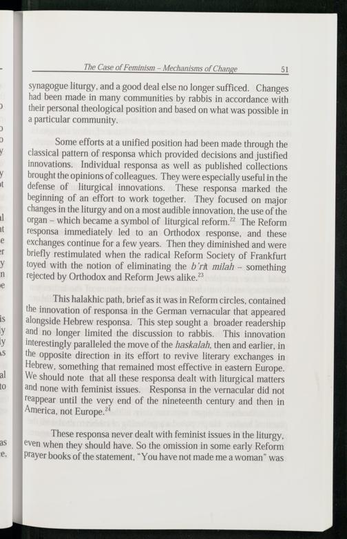 These responsa never dealt with feminist issues in the liturgy, ven when they should have. So the omission in some early Reform Prayer books of the statement,“You have not made me a woman” was