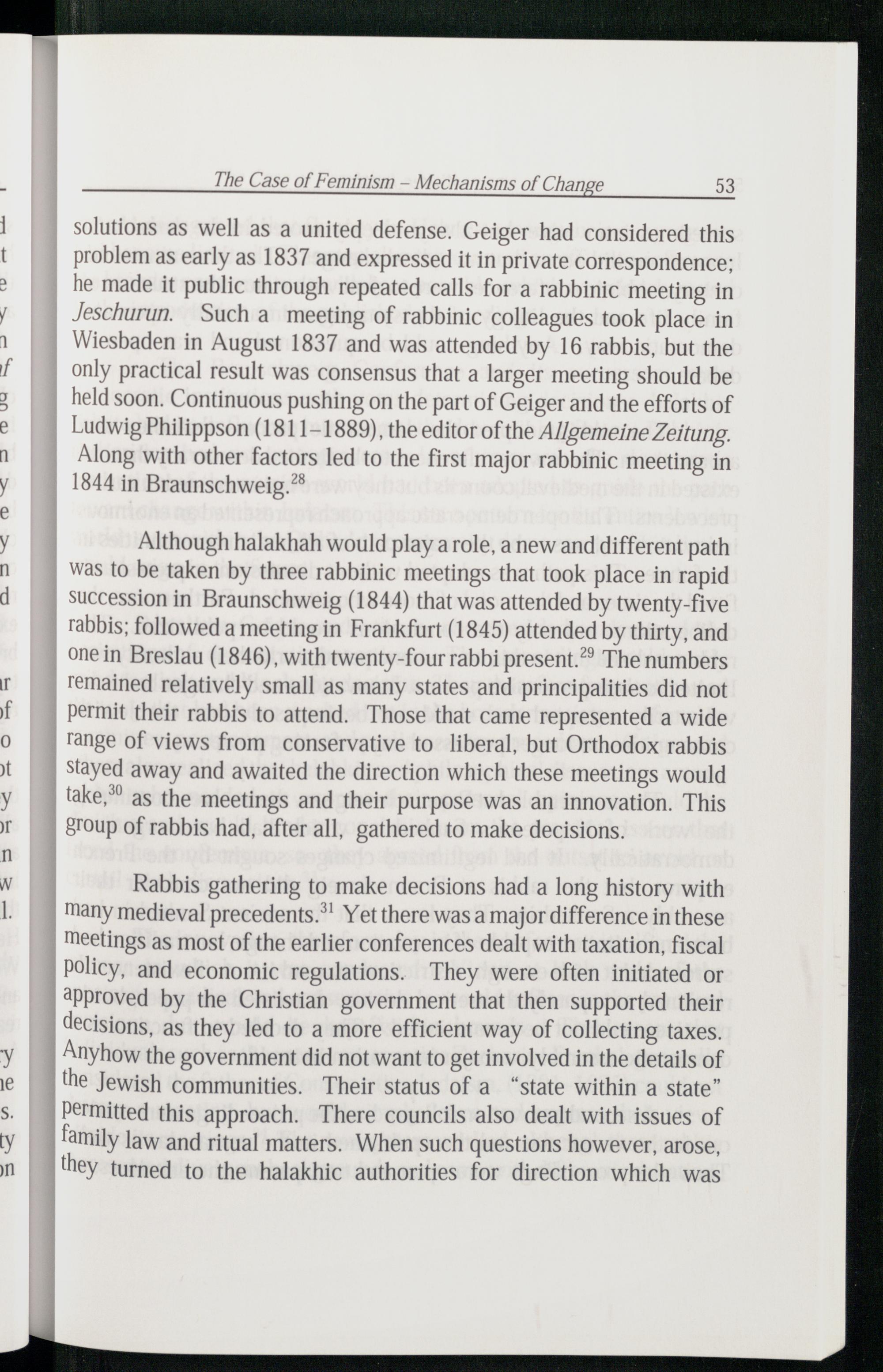 solutions as well as a united defense. Geiger had considered this problem as early as 1837 and expressed it in private correspondence: he made it public through repeated calls for a rabbinic meeting in Jeschurun. Such a meeting of rabbinic colleagues took place in Wiesbaden in August 1837 and was attended by 16 rabbis, but the only practical result was consensus that a larger meeting should be held soon. Continuous pushing on the part of Geiger and the efforts of Ludwig Philippson (1811-1889), the editor of the Allgemeine Zeitung . Along with other factors led to the first major rabbinic meeting in 1844 in Braunschweig .
