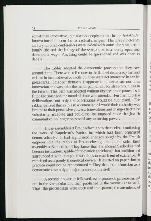 The rabbis adopted the democratic process that they saw around them. There were references to the limited democracy that had existed in the medieval councils but they were not interested in earlier precedents. This open democratic approach represented an enormous innovation and was to be the major path of all Jewish communities in the future. This path was adopted without discussion or protest as it fitted the times and the mood of those who attended. Furthermore, the deliberations, not only the conclusions would be publicized. The rabbis realized that in this new emancipated world their authority was limited to their persuasive powers. Innovations and changes had to be voluntarily accepted and could not be imposed since the Jewish communities no longer possessed any enforcing power.