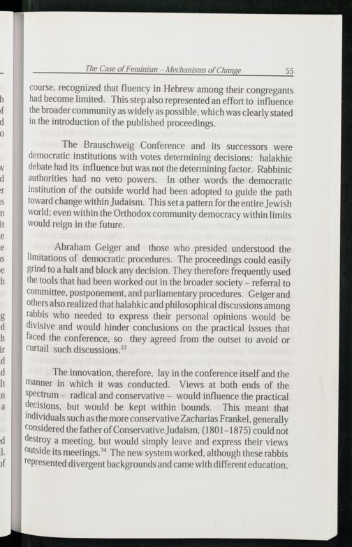 Abraham Geiger and those who presided understood the limitations of democratic procedures. The proceedings could easily grind to a halt and block any decision. They therefore frequently used the tools that had been worked out in the broader society— referral to committee, postponement, and parliamentary procedures. Geigerand others also realized that halahkic and philosophical discussions among rabbis who needed to express their personal opinions would be divisive and would hinder conclusions on the practical issues that faced the conference, so they agreed from the outset to avoid or Curtail such discussions.*
