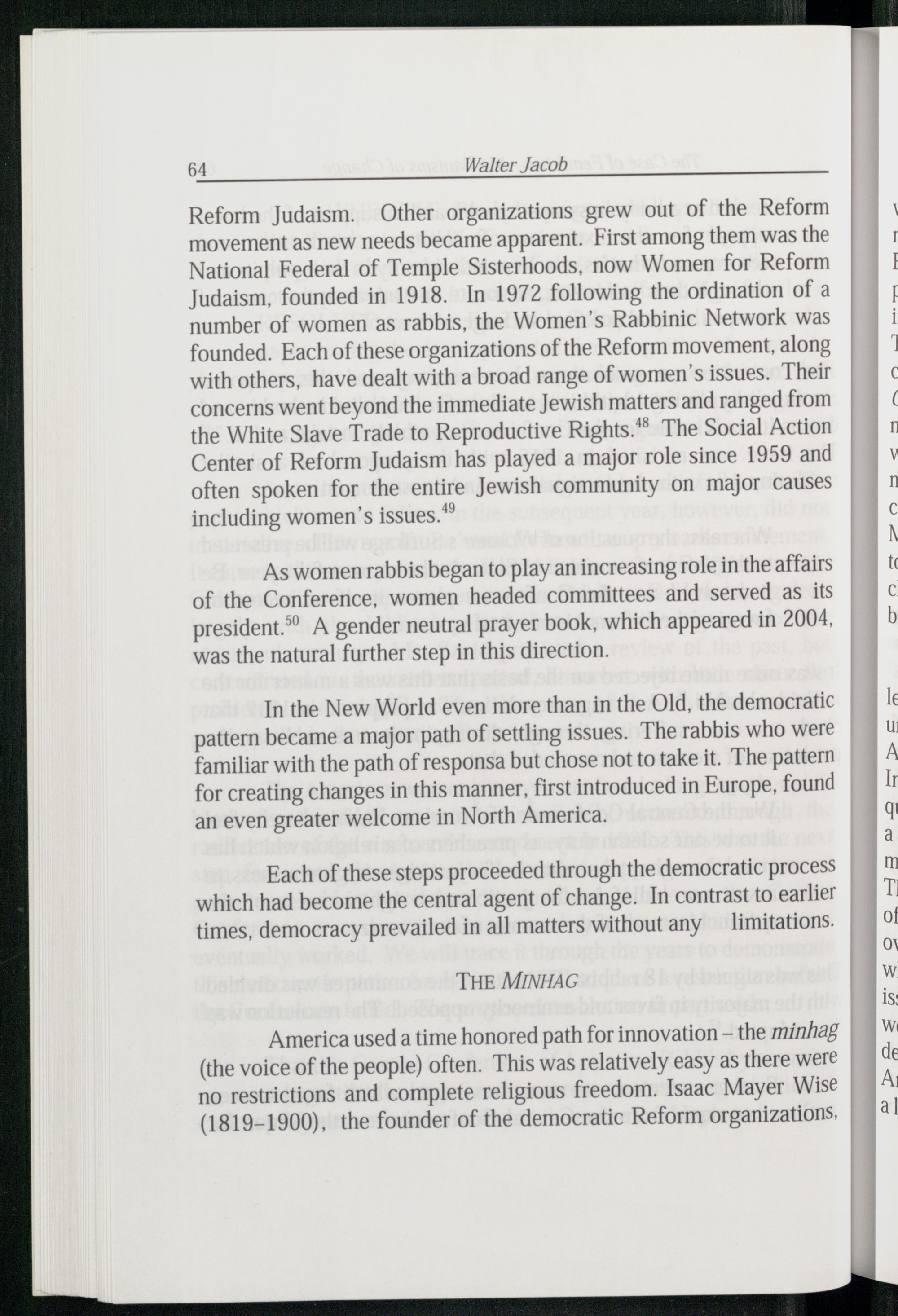 America used a time honored path for innovation- the minhag (the voice of the people) often. This was relatively easy as there were no restrictions and complete religious freedom. Isaac Mayer Wise (1819-1900), the founder of the democratic Reform organizations,
