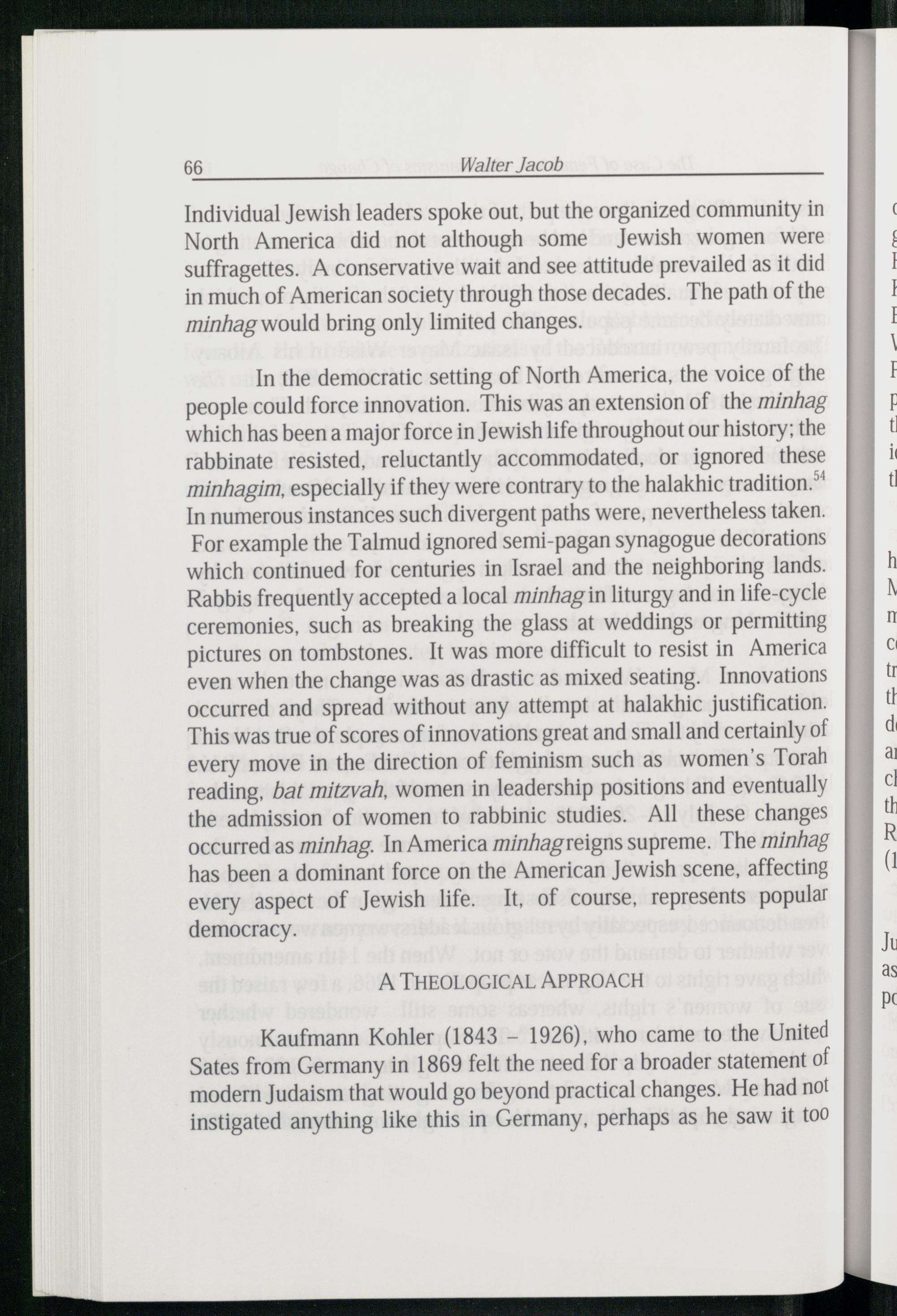 In the democratic setting of North America , the voice of the people could force innovation. This was an extension of the minhag which has been a major force in Jewish life throughout our history; the rabbinate resisted, reluctantly accommodated, or ignored these minhagim, especially if they were contrary to the halakhic tradition.” In numerous instances such divergent paths were, nevertheless taken. For example the Talmud ignored semi-pagan synagogue decorations which continued for centuries in Israel and the neighboring lands. Rabbis frequently accepted a local minhag in liturgy and in life-cycle ceremonies, such as breaking the glass at weddings or permitting pictures on tombstones. It was more difficult to resist in America even when the change was as drastic as mixed seating. Innovations occurred and spread without any attempt at halakhic justification. This was true of scores of innovations great and small and certainly of every move in the direction of feminism such as women's Torah reading, bat mitzvah, women in leadership positions and eventually the admission of women to rabbinic studies. All these changes occurred as minhag. In America minhagreigns supreme. The minhag has been a dominant force on the American Jewish scene, affecting every aspect of Jewish life. It, of course, represents popular democracy.
