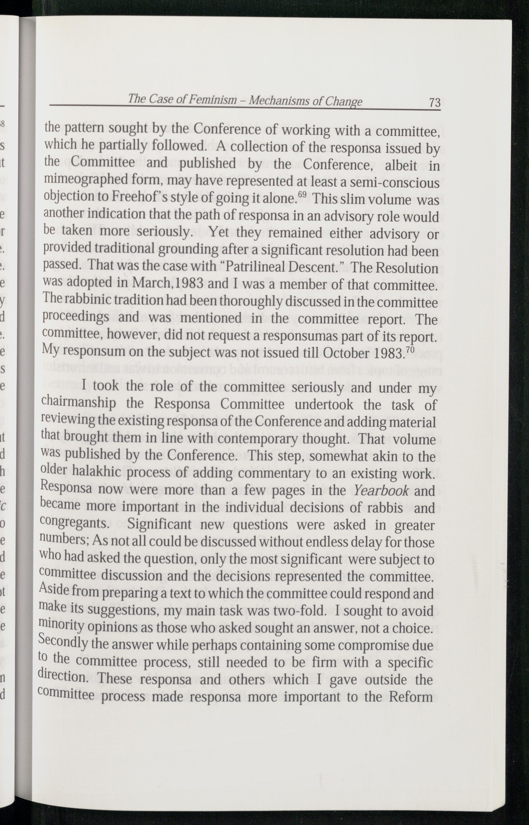 the pattern sought by the Conference of working with a committee, which he partially followed. A collection of the responsa issued by the Committee and published by the Conference, albeit in mimeographed form, may have represented at least a semi-conscious objection to Freehof’s style of going it alone.*®® This slim volume was another indication that the path of responsa in an advisory role would be taken more seriously. Yet they remained either advisory or provided traditional grounding after a significant resolution had been passed. That was the case with“Patrilineal Descent .” The Resolution was adopted in March,1983 and I was a member of that committee. The rabbinic tradition had been thoroughly discussed in the committee proceedings and was mentioned in the committee report. The committee, however, did not request a responsumas part of its report. My responsum on the subject was not issued till October 1983.”