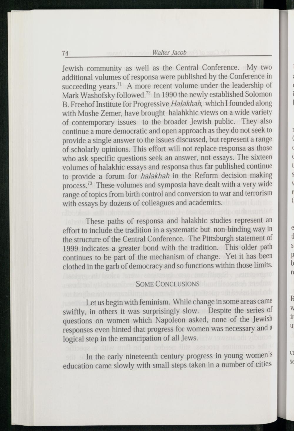 Jewish community as well as the Central Conference. My two additional volumes of responsa were published by the Conference in succeeding years.” A more recent volume under the leadership of Mark Washofsky followed.” In 1990 the newly established Solomon B. Freehof Institute for Progressive Halakhah, which founded along with Moshe Zemer , have brought halahkhic views on a wide variety of contemporary issues to the broader Jewish public. They also continue a more democratic and open approach as they do not seek to provide a single answer to the issues discussed, but represent a range of scholarly opinions. This effort will not replace responsa as those who ask specific questions seek an answer, not essays. The sixteen volumes of halakhic essays and responsa thus far published continue to provide a forum for halakhah in the Reform decision making process.”® These volumes and symposia have dealt with a very wide range of topics from birth control and conversion to war and terrorism with essays by dozens of colleagues and academics.