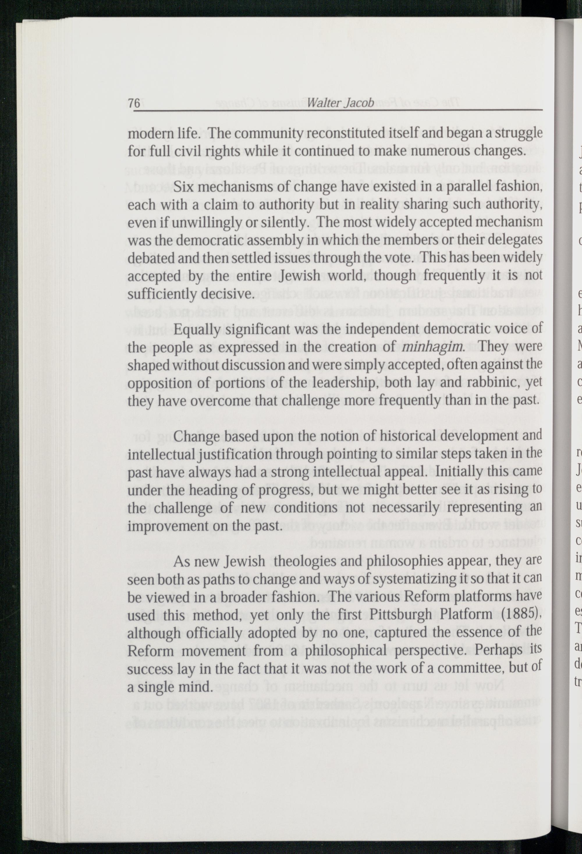 Six mechanisms of change have existed in a parallel fashion, each with a claim to authority but in reality sharing such authority, even if unwillingly or silently. The most widely accepted mechanism was the democratic assembly in which the members or their delegates debated and then settled issues through the vote. This has been widely accepted by the entire Jewish world, though frequently it is not sufficiently decisive.