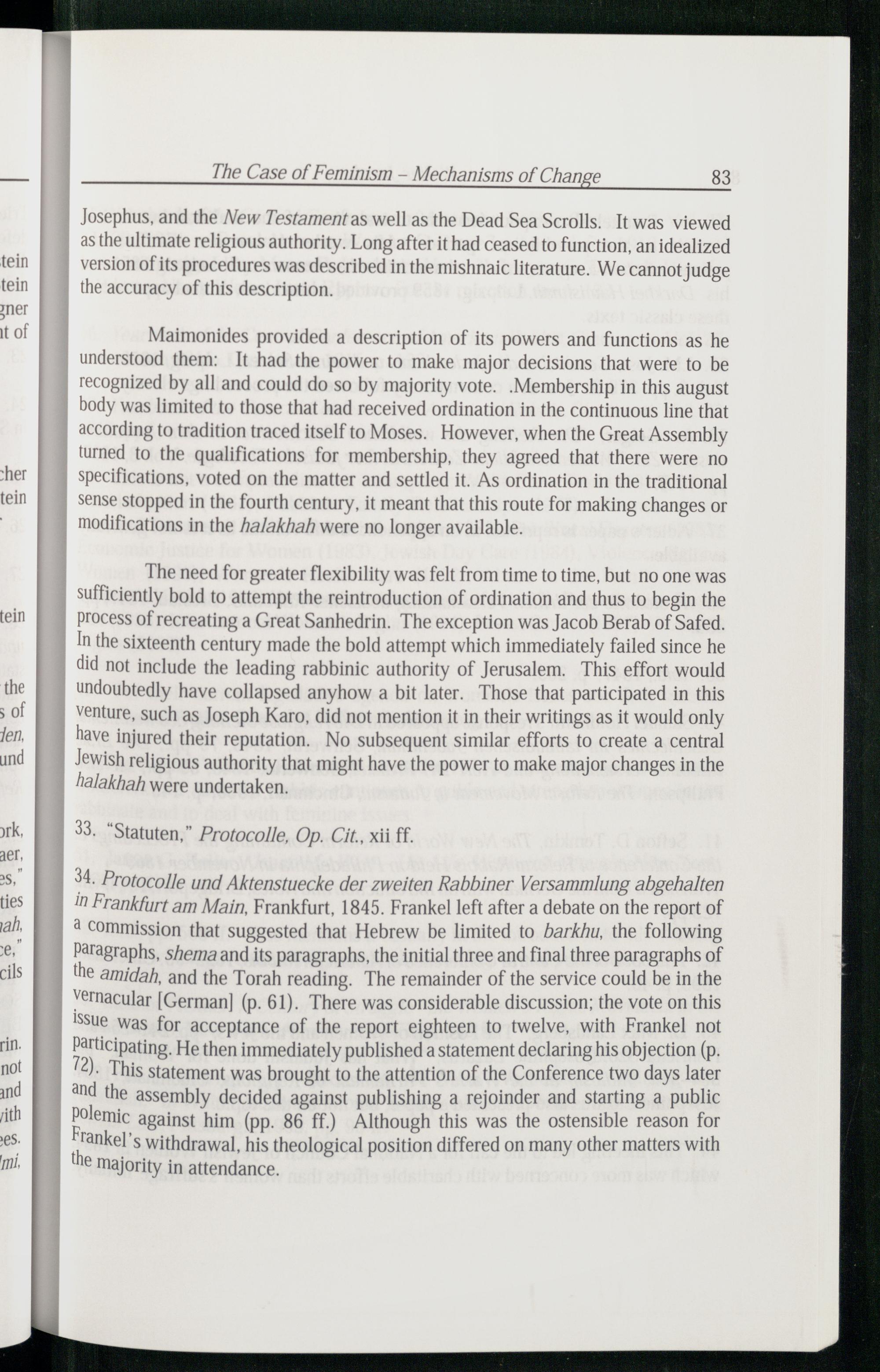 34. Protocolle und Aktenstuecke der zweiten Rabbiner Versammlung abgehalten in Frankfurt am Main, Frankfurt, 1845. Frankel left after a debate on the report of d Commission that suggested that Hebrew be limited to barkhu, the following Paragraphs, shemaand its paragraphs, the initial three and final three paragraphs of the amidah, and the Torah reading. The remainder of the service could be in the Vernacular[German](p. 61). There was considerable discussion; the vote on this ISsue was for acceptance of the report eighteen to twelve, with Frankel not Participating. He then immediately published a statement declaring his objection(p. 72). This statement was brought to the attention of the Conference two days later and the assembly decided against publishing a rejoinder and starting a public polemic against him(pp. 86 ff.) Although this was the ostensible reason for Franke]’s withdrawal, his theological position differed on many other matters with the Majority in attendance.