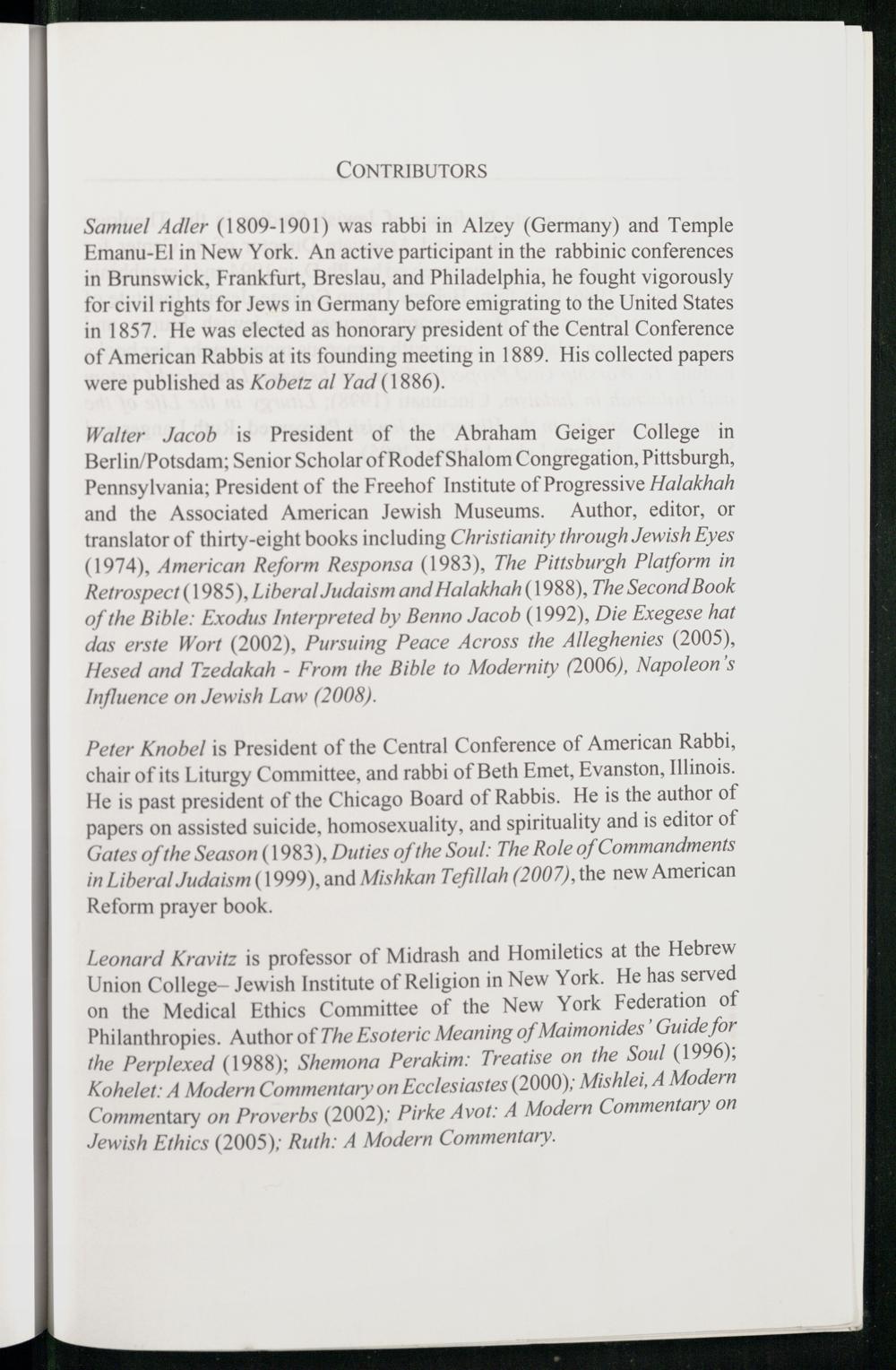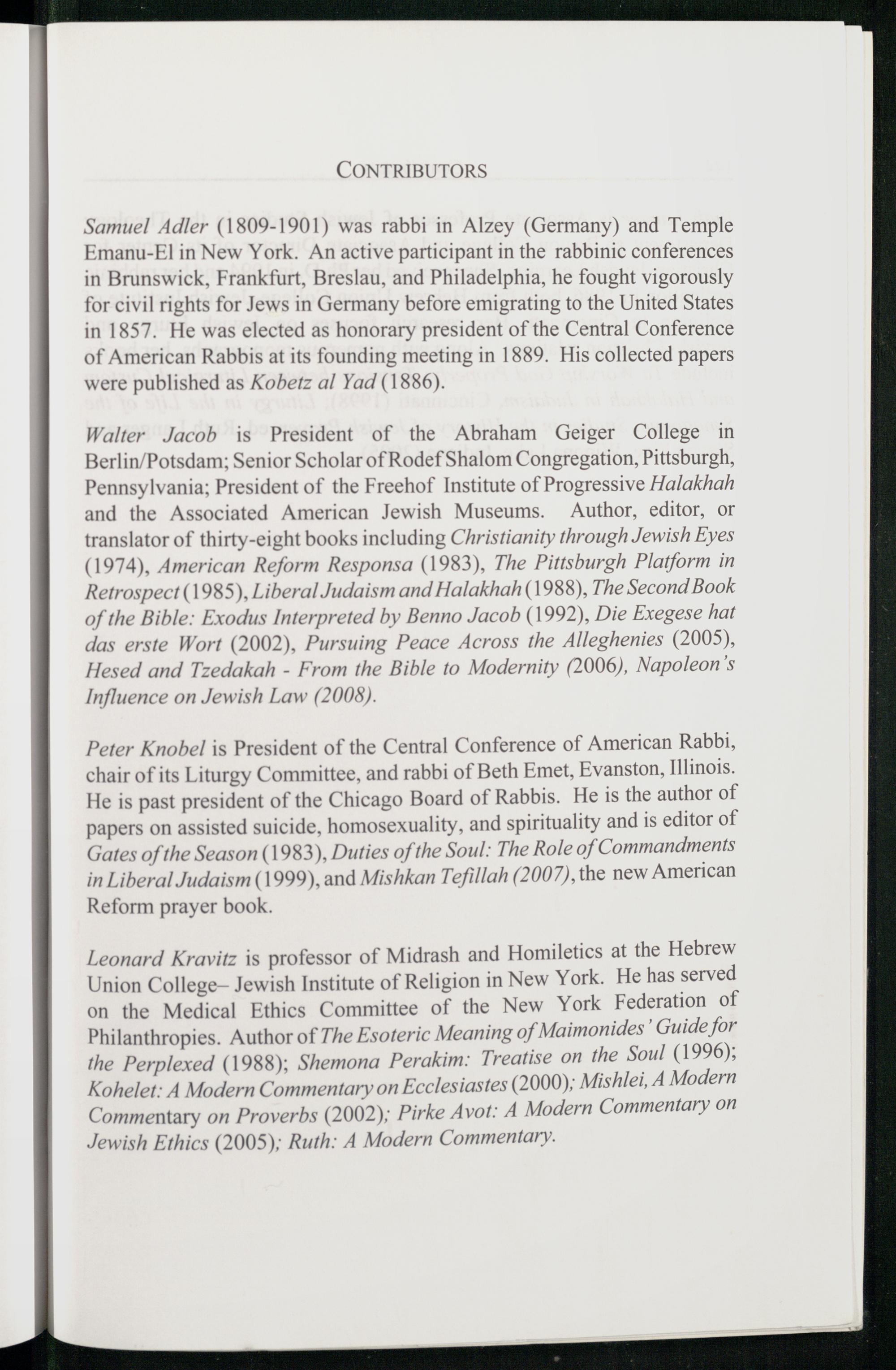 Leonard Kravitz is professor of Midrash and Homiletics at the Hebrew Union College— Jewish Institute of Religion in New York . He has served on the Medical Ethics Committee of the New York Federation of Philanthropies. Author of The Esoteric Meaning of Maimonides’ Guide for the Perplexed(1988); Shemona Perakim: Treatise on the Soul(1996); Kohelet: A Modern Commentary on Ecclesiastes(2000); Mishlei, A Modern Commentary on Proverbs(2002); Pirke Avot: A Modern Commentary on Jewish Ethics(2005); Ruth: A Modern Commentary.