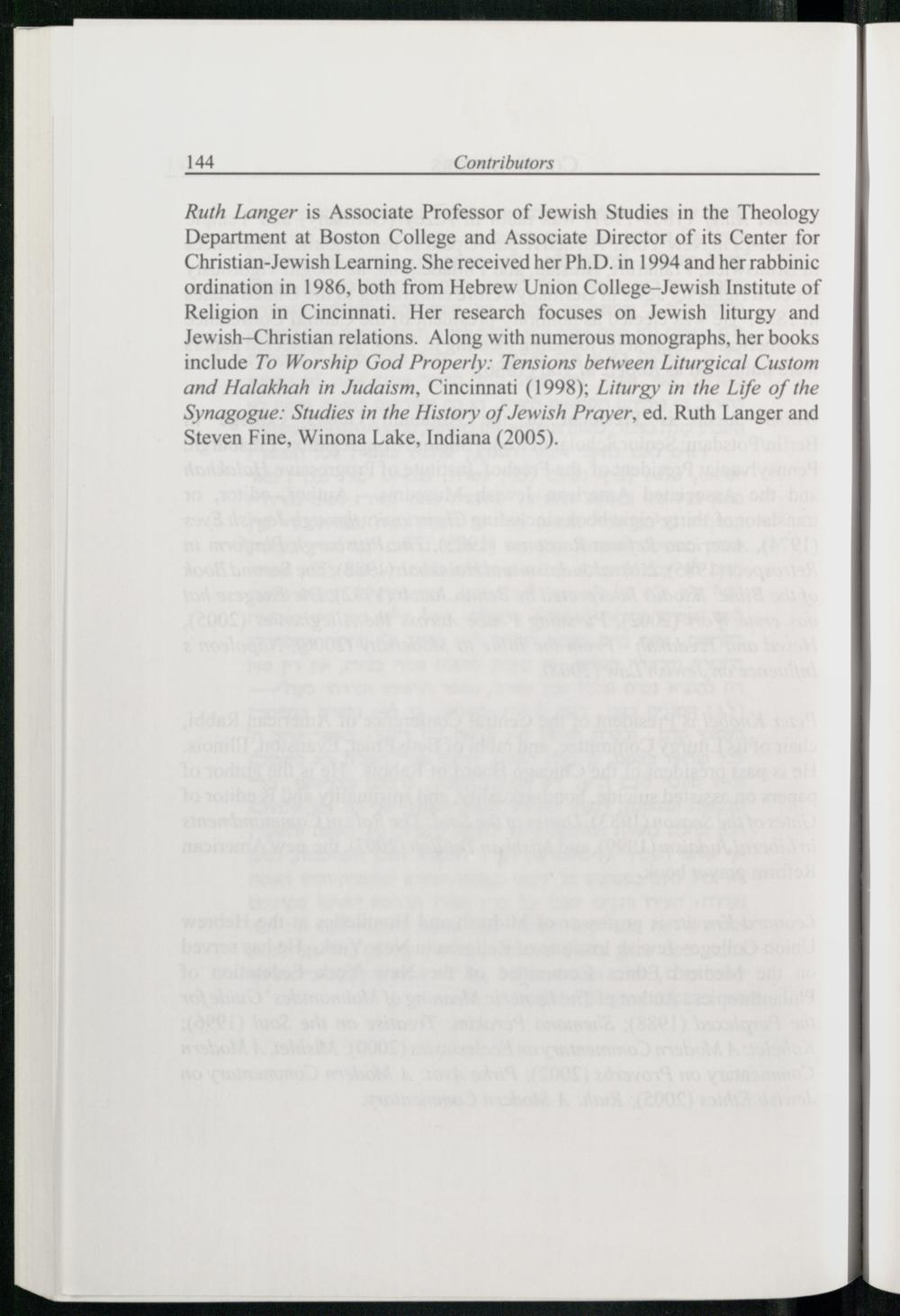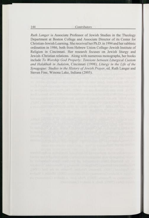 Ruth Langer is Associate Professor of Jewish Studies in the Theology Department at Boston College and Associate Director of its Center for Christian-Jewish Learning . She received her Ph.D. in 1994 and her rabbinic ordination in 1986, both from Hebrew Union College-Jewish Institute of Religion in Cincinnati . Her research focuses on Jewish liturgy and Jewish —Christian relations. Along with numerous monographs, her books include To Worship God Properly: Tensions between Liturgical Custom and Halakhah in Judaism, Cincinnati (1998); Liturgy in the Life of the Synagogue: Studies in the History of Jewish Prayer, ed. Ruth Langer and Steven Fine , Winona Lake, Indiana (2005).