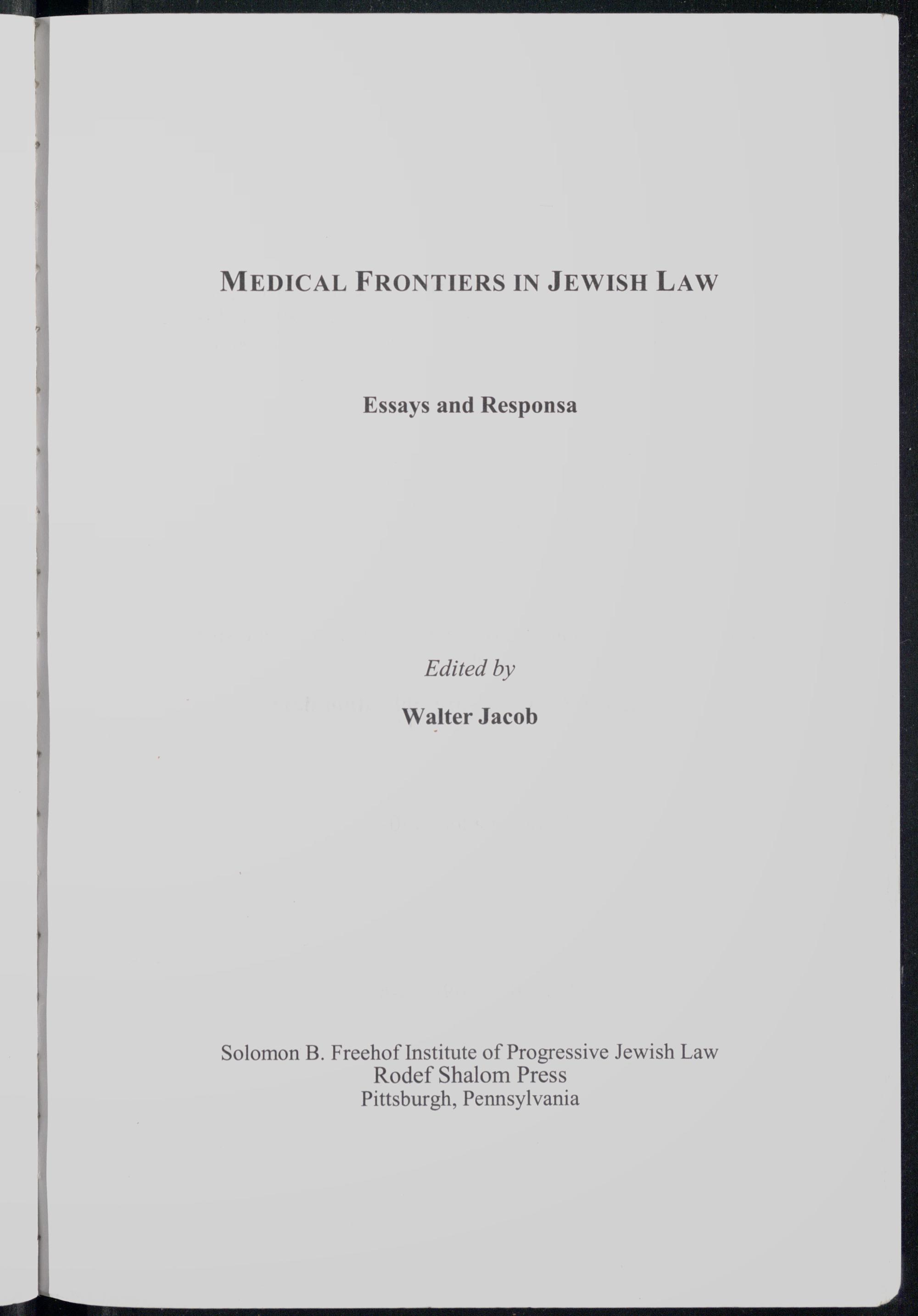 MEDICAL FRONTIERS IN JEWISH LAW Essays and Responsa Edited by Walter Jacob Solomon B. Freehof Institute of Progressive Jewish Law Rodef Shalom Press Pittsburgh , Pennsylvania