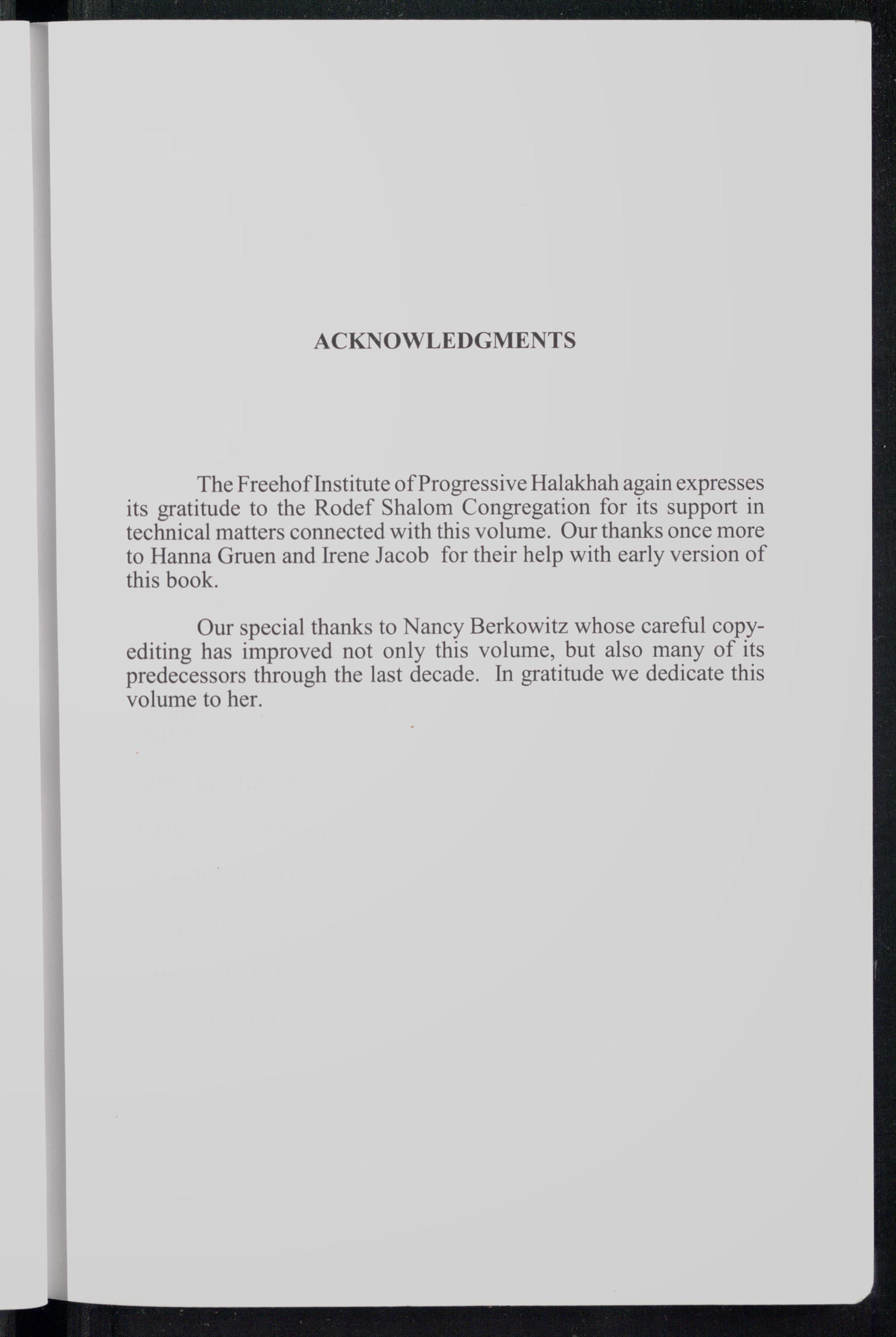 The Freehof Institute of Progressive Halakhah again expresses its gratitude to the Rodef Shalom Congregation for its support in technical matters connected with this volume. Our thanks once more to Hanna Gruen and Irene Jacob for their help with early version of this book.
