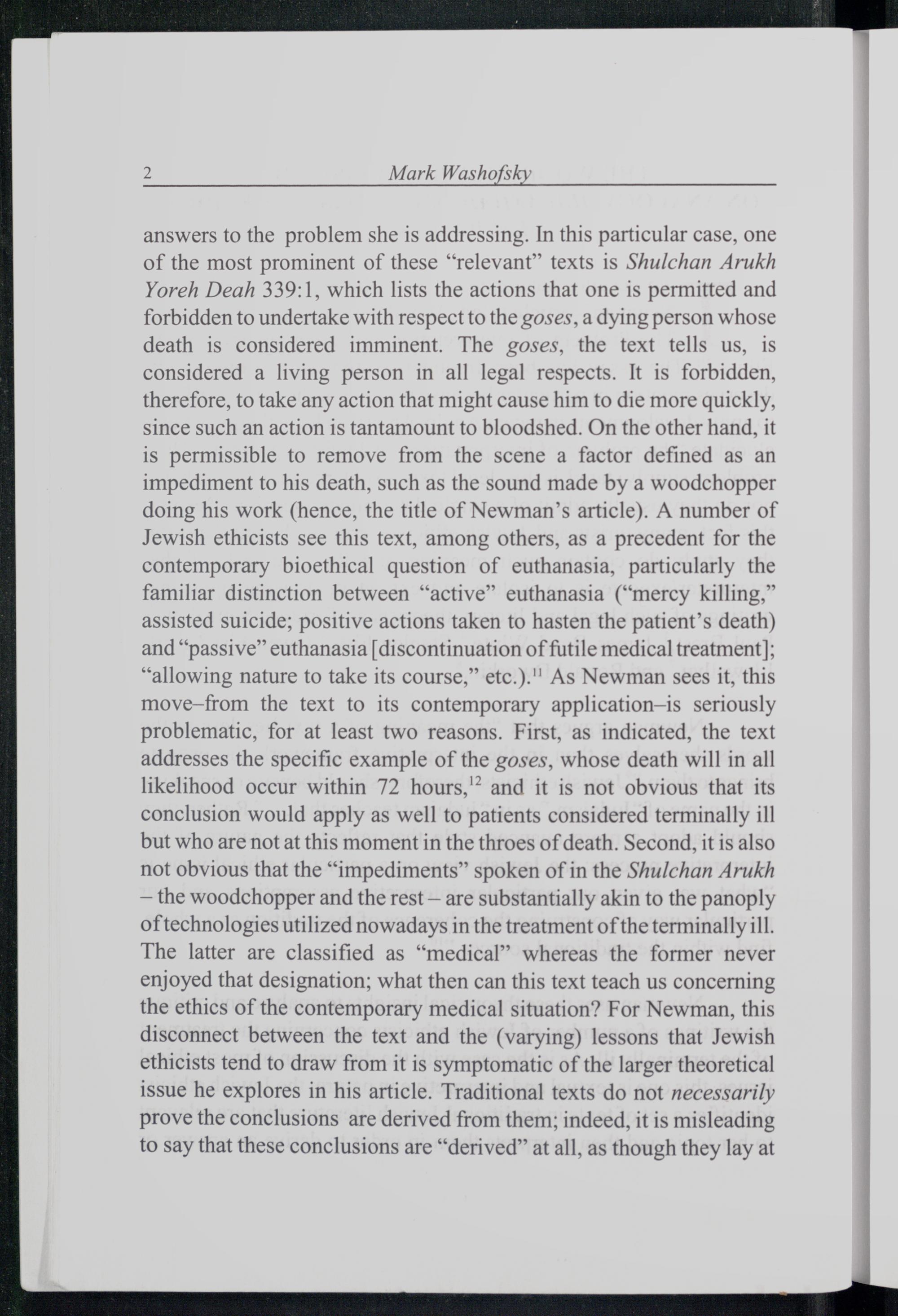 answers to the problem she is addressing. In this particular case, one of the most prominent of these“relevant” texts is Shulchan Arukh Yoreh Deah 339:1, which lists the actions that one is permitted and forbidden to undertake with respect to the goses, a dying person whose death is considered imminent. The goses, the text tells us, is considered a living person in all legal respects. It is forbidden, therefore, to take any action that might cause him to die more quickly, since such an action is tantamount to bloodshed. On the other hand, it 1s permissible to remove from the scene a factor defined as an impediment to his death, such as the sound made by a woodchopper doing his work(hence, the title of Newman’s article). A number of Jewish ethicists see this text, among others, as a precedent for the contemporary bioethical question of euthanasia, particularly the familiar distinction between“active” euthanasia(“mercy killing,” assisted suicide; positive actions taken to hasten the patient’s death) and“passive” euthanasia[discontinuation of futile medical treatment]; “allowing nature to take its course,” etc.)."! As Newman sees it, this move—from the text to its contemporary application—is seriously problematic, for at least two reasons. First, as indicated, the text addresses the specific example of the goses, whose death will in all likelihood occur within 72 hours,'? and it is not obvious that its conclusion would apply as well to patients considered terminally ill but who are not at this moment in the throes of death. Second, it is also not obvious that the“impediments” spoken of in the Shulchan Arukh — the woodchopper and the rest— are substantially akin to the panoply of technologies utilized nowadays in the treatment of the terminally ill. The latter are classified as“medical” whereas the former never enjoyed that designation; what then can this text teach us concerning the ethics of the contemporary medical situation? For Newman, this disconnect between the text and the(varying) lessons that Jewish ethicists tend to draw from it is symptomatic of the larger theoretical issue he explores in his article. Traditional texts do not necessarily prove the conclusions are derived from them; indeed, it is misleading to say that these conclusions are“derived” at all, as though they lay at