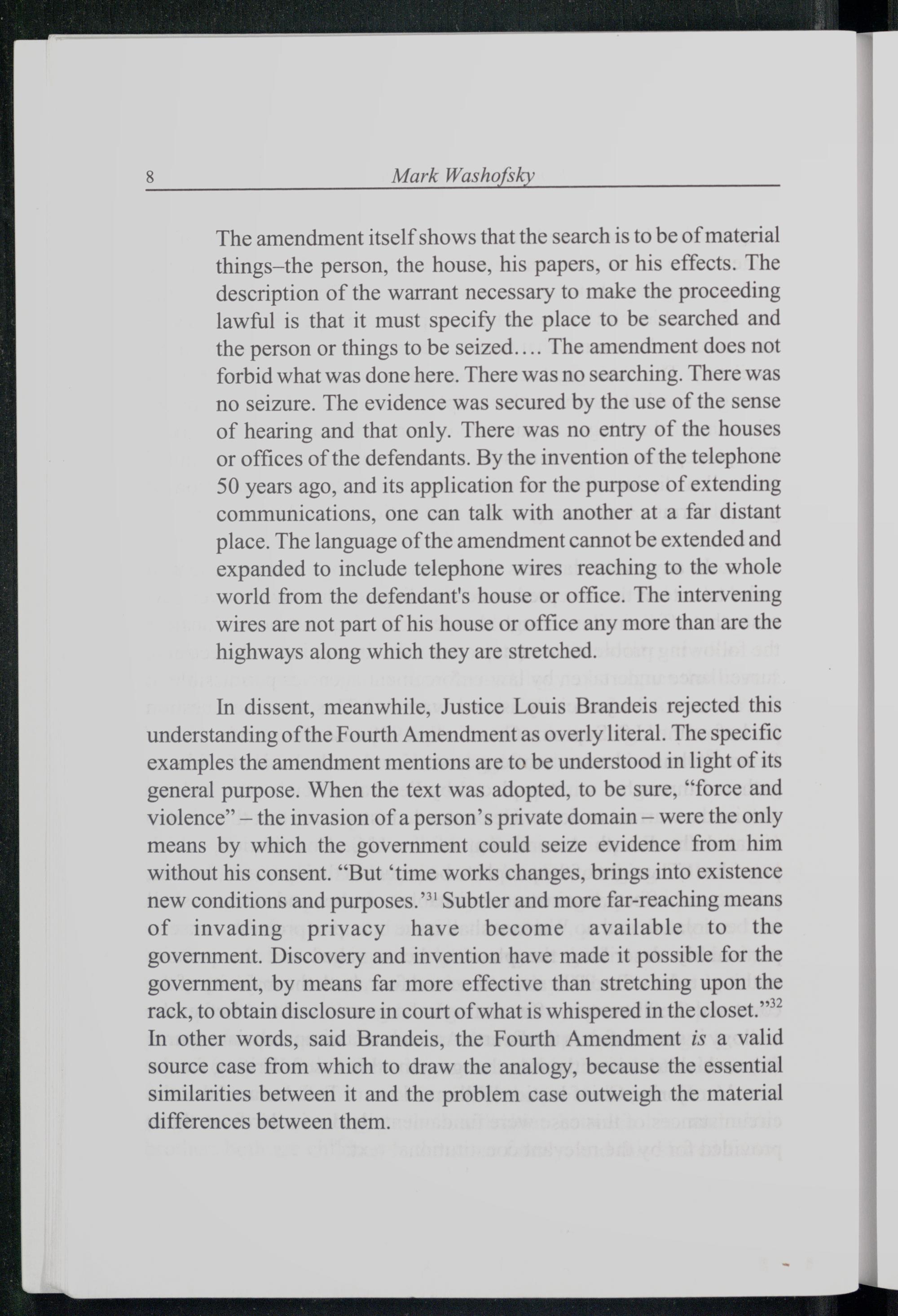 In dissent, meanwhile, Justice Louis Brandeis rejected this understanding of the Fourth Amendment as overly literal. The specific examples the amendment mentions are to be understood in light of its general purpose. When the text was adopted, to be sure,“force and violence”— the invasion of a person’s private domain— were the only means by which the government could seize evidence from him without his consent.“But‘time works changes, brings into existence new conditions and purposes.” Subtler and more far-reaching means of invading privacy have become available to the government. Discovery and invention have made it possible for the government, by means far more effective than stretching upon the rack, to obtain disclosure in court of what is whispered in the closet.” In other words, said Brandeis, the Fourth Amendment is a valid source case from which to draw the analogy, because the essential similarities between it and the problem case outweigh the material differences between them.