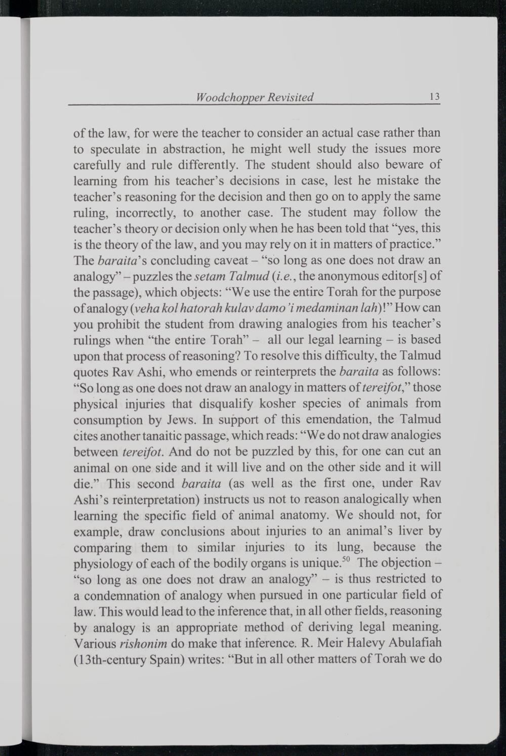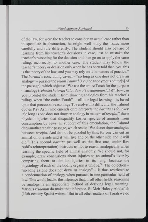 of the law, for were the teacher to consider an actual case rather than to speculate in abstraction, he might well study the issues more carefully and rule differently. The student should also beware of learning from his teacher’s decisions in case, lest he mistake the teacher’s reasoning for the decision and then go on to apply the same ruling, incorrectly, to another case. The student may follow the teacher’s theory or decision only when he has been told that“yes, this is the theory of the law, and you may rely on it in matters of practice.” The baraita’s concluding caveat—“so long as one does not draw an analogy”— puzzles the setam Talmud (i.e., the anonymous editor[s] of the passage), which objects:“We use the entire Torah for the purpose of analogy(veha kol hatorah kulav damo i medaminan lah)!” How can you prohibit the student from drawing analogies from his teacher’s rulings when“the entire Torah”— all our legal learning— is based upon that process of reasoning? To resolve this difficulty, the Talmud quotes Rav Ashi, who emends or reinterprets the baraita as follows: “So long as one does not draw an analogy in matters of tereifot,” those physical injuries that disqualify kosher species of animals from consumption by Jews . In support of this emendation, the Talmud cites another tanaitic passage, which reads:“We do not draw analogies between tereifot. And do not be puzzled by this, for one can cut an animal on one side and it will live and on the other side and it will die.” This second baraita(as well as the first one, under Rav Ashi’s reinterpretation) instructs us not to reason analogically when learning the specific field of animal anatomy. We should not, for example, draw conclusions about injuries to an animal’s liver by comparing them to similar injuries to its lung, because the physiology of each of the bodily organs is unique.” The objection— “so long as one does not draw an analogy”— is thus restricted to a condemnation of analogy when pursued in one particular field of law. This would lead to the inference that, in all other fields, reasoning by analogy is an appropriate method of deriving legal meaning. Various rishonim do make that inference. R. Meir Halevy Abulafiah (13th-century Spain) writes:“But in all other matters of Torah we do