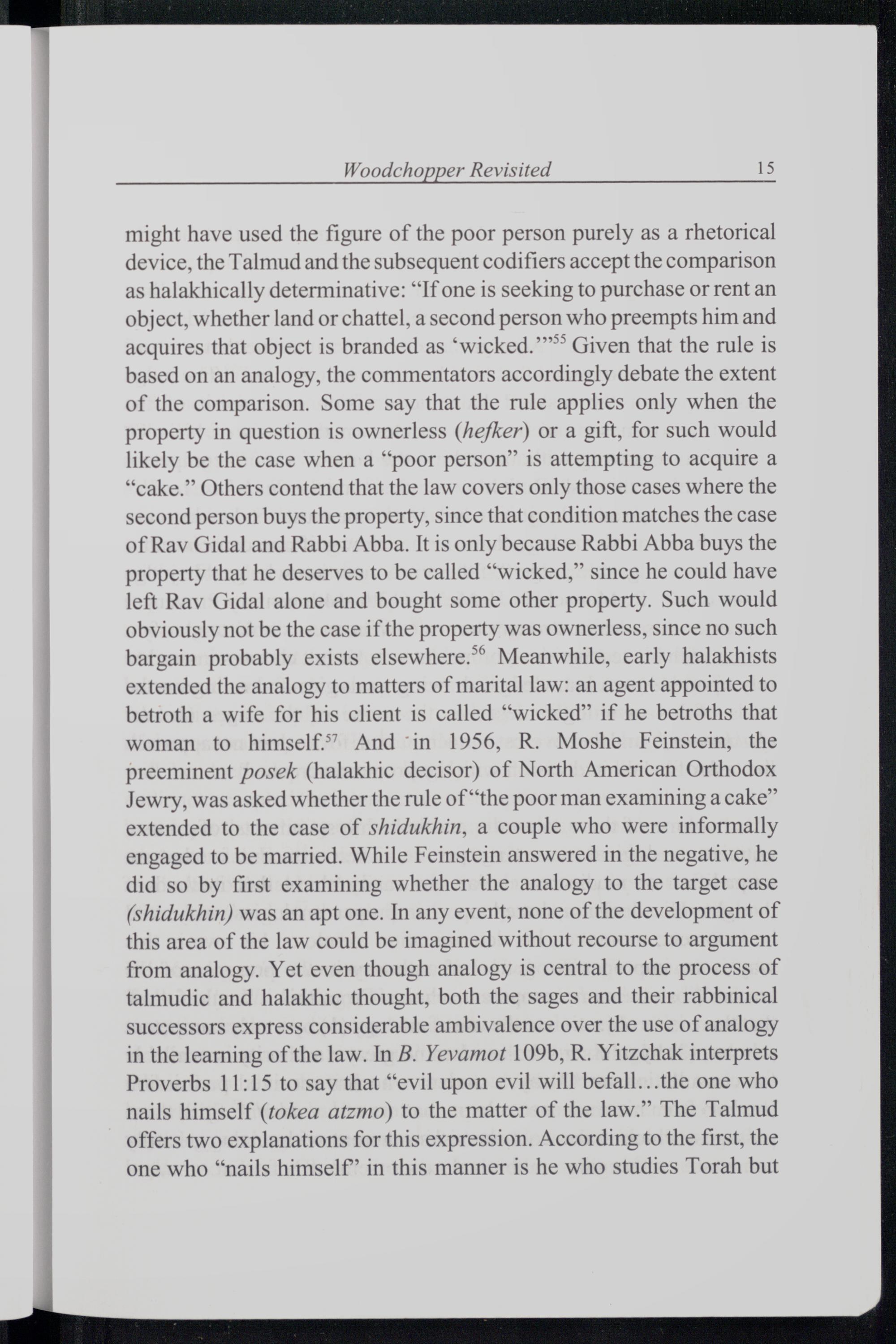 might have used the figure of the poor person purely as a rhetorical device, the Talmud and the subsequent codifiers accept the comparison as halakhically determinative:“If one is seeking to purchase or rent an object, whether land or chattel, a second person who preempts him and acquires that object is branded as‘wicked. Given that the rule is based on an analogy, the commentators accordingly debate the extent of the comparison. Some say that the rule applies only when the property in question is ownerless(iefker) or a gift, for such would likely be the case when a“poor person” is attempting to acquire a “cake.” Others contend that the law covers only those cases where the second person buys the property, since that condition matches the case of Rav Gidal and Rabbi Abba. It is only because Rabbi Abba buys the property that he deserves to be called“wicked,” since he could have left Rav Gidal alone and bought some other property. Such would obviously not be the case if the property was ownerless, since no such bargain probably exists elsewhere.’ Meanwhile, early halakhists extended the analogy to matters of marital law: an agent appointed to betroth a wife for his client is called“wicked” if he betroths that woman to himself” And"in 1956, R. Moshe Feinstein , the preeminent posek(halakhic decisor) of North American Orthodox Jewry, was asked whether the rule of“the poor man examining a cake” extended to the case of shidukhin, a couple who were informally engaged to be married. While Feinstein answered in the negative, he did so by first examining whether the analogy to the target case (shidukhin) was an apt one. In any event, none of the development of this area of the law could be imagined without recourse to argument from analogy. Yet even though analogy is central to the process of talmudic and halakhic thought, both the sages and their rabbinical successors express considerable ambivalence over the use of analogy in the learning of the law. In B. Yevamot 109b, R. Yitzchak interprets Proverbs 11:15 to say that“evil upon evil will befall...the one who nails himself(tokea atzmo) to the matter of the law.” The Talmud offers two explanations for this expression. According to the first, the one who“nails himself” in this manner is he who studies Torah but
