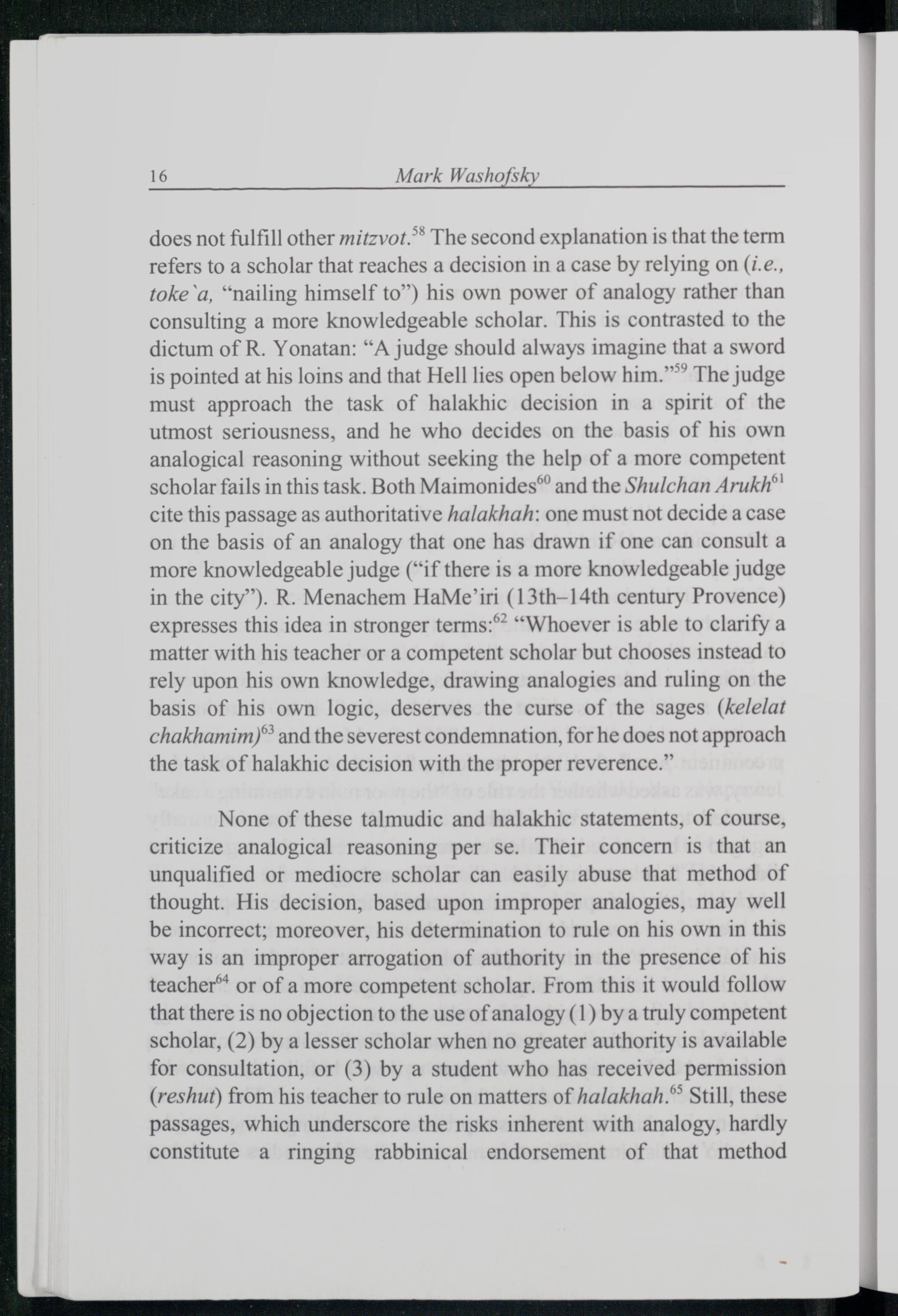 does not fulfill other mitzvot.”® The second explanation is that the term refers to a scholar that reaches a decision in a case by relying on(i.e., toke a,“nailing himself to”) his own power of analogy rather than consulting a more knowledgeable scholar. This is contrasted to the dictum of R. Yonatan:“A judge should always imagine that a sword is pointed at his loins and that Hell lies open below him.” The judge must approach the task of halakhic decision in a spirit of the utmost seriousness, and he who decides on the basis of his own analogical reasoning without seeking the help of a more competent scholar fails in this task. Both Maimonides ® and the Shulchan Arukh®' cite this passage as authoritative halakhah: one must not decide a case on the basis of an analogy that one has drawn if one can consult a more knowledgeable judge(“if there is a more knowledgeable judge in the city”). R. Menachem HaMe’iri(13th—14th century Provence ) expresses this idea in stronger terms:**“Whoever is able to clarify a matter with his teacher or a competent scholar but chooses instead to rely upon his own knowledge, drawing analogies and ruling on the basis of his own logic, deserves the curse of the sages(kelelat chakhamim)® and the severest condemnation, for he does not approach the task of halakhic decision with the proper reverence.”