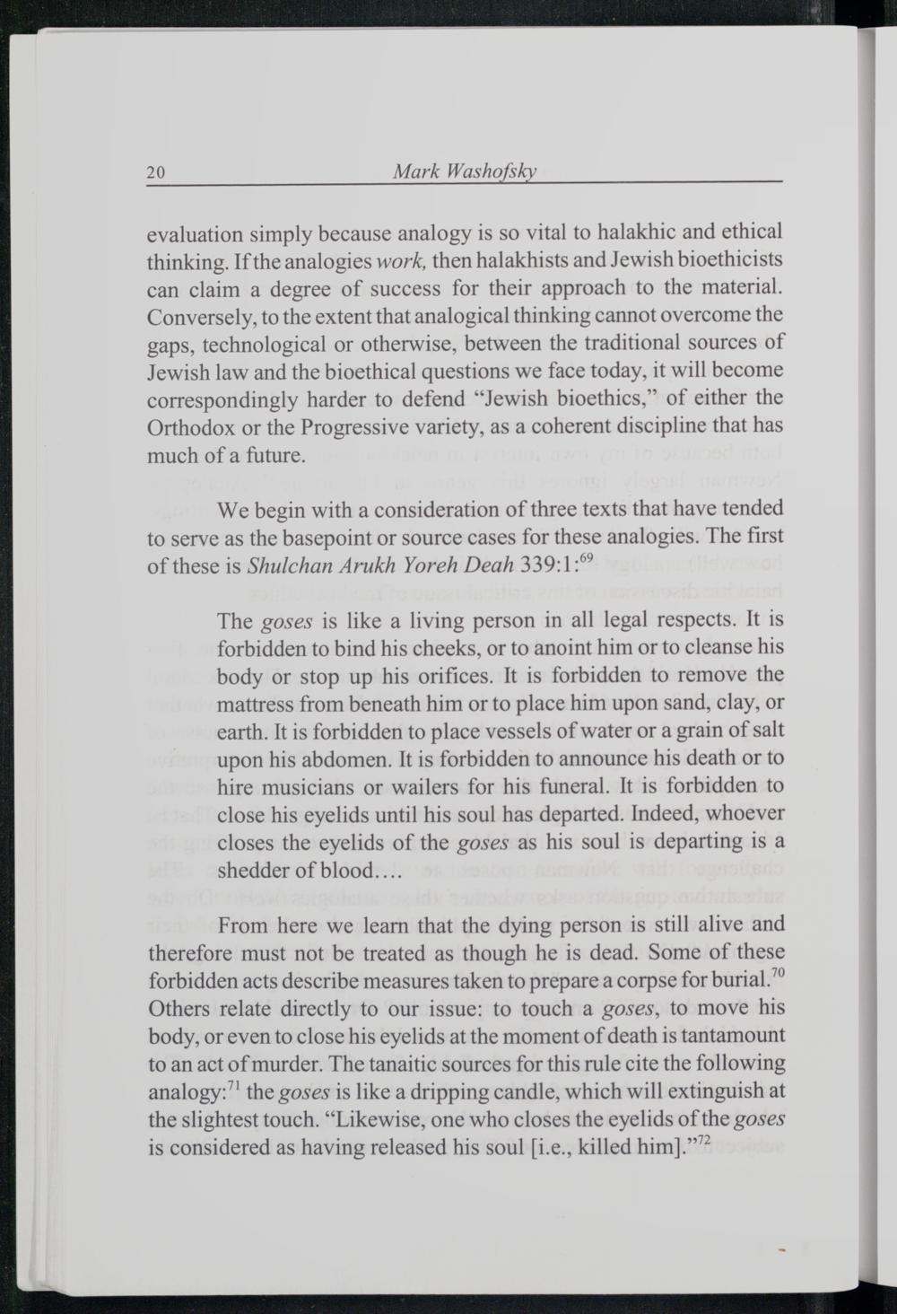 evaluation simply because analogy is so vital to halakhic and ethical thinking. If the analogies work, then halakhists and Jewish bioethicists can claim a degree of success for their approach to the material. Conversely, to the extent that analogical thinking cannot overcome the gaps, technological or otherwise, between the traditional sources of Jewish law and the bioethical questions we face today, it will become correspondingly harder to defend“Jewish bioethics,” of either the Orthodox or the Progressive variety, as a coherent discipline that has much of a future.